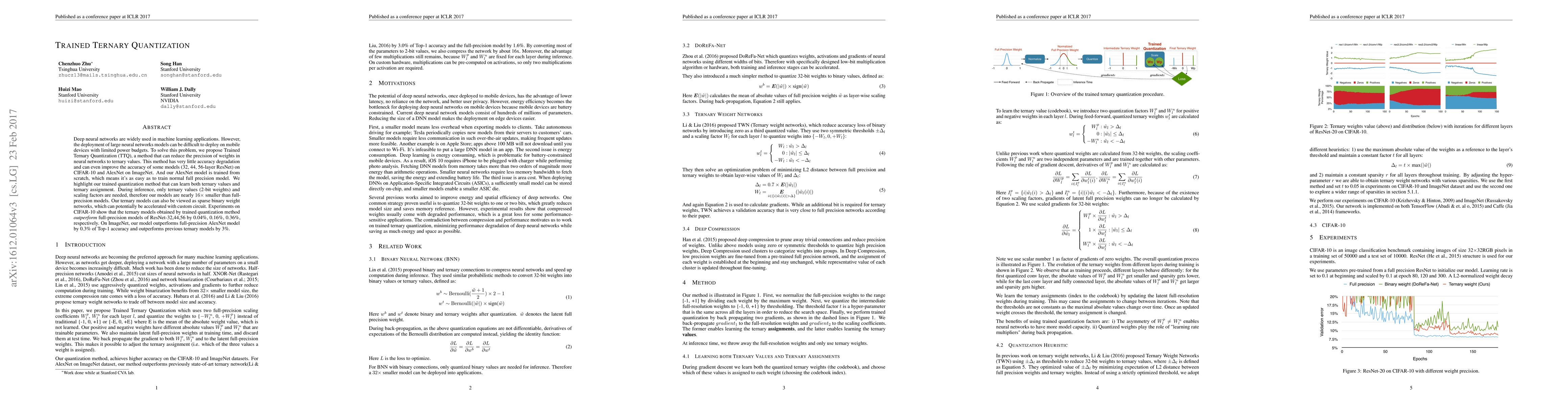 Trained Ternary Quantization (TTQ) reduces neural network weights to ternary values, achieving minimal accuracy loss and sometimes even accuracy gains, while making models nearly 16x smaller and potentially enabling custom circuit acceleration. Experiments show improved performance over full-precision models on CIFAR-10 and ImageNet.