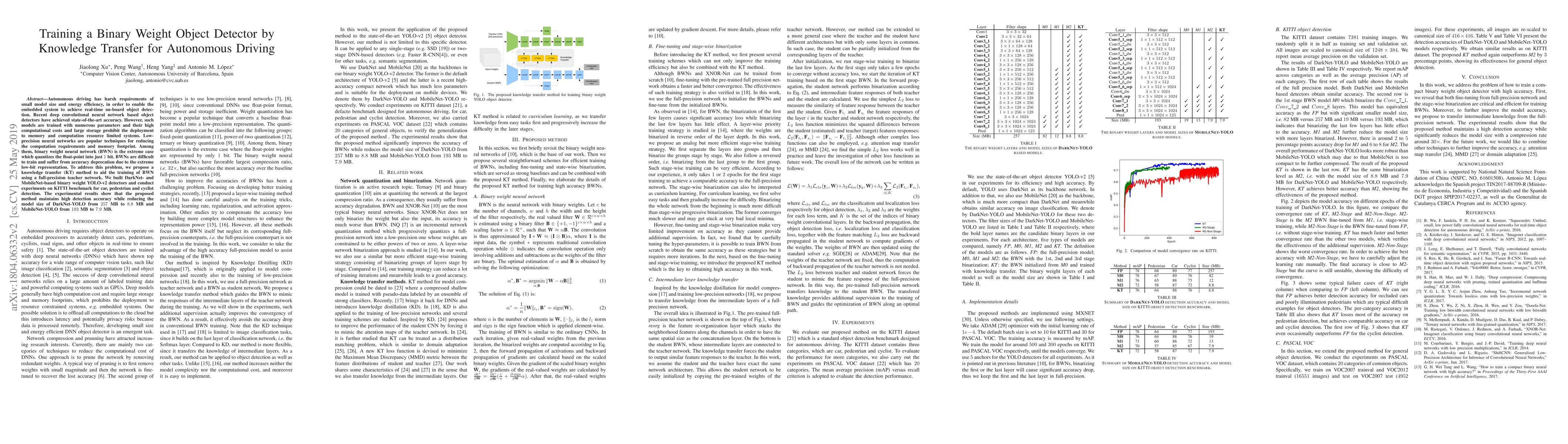 Autonomous driving has harsh requirements of small model size and energy efficiency, in order to enable the embedded system to achieve real-time on-board object detection. Recent deep convolutional neural network based object detectors have achieved state-of-the-art accuracy. However, such models are trained with numerous parameters and their high computational costs and large storage prohibit the deployment to memory and computation resource limited systems. Low-precision neural networks are popular techniques for reducing the computation requirements and memory footprint. Among them, binary weight neural network (BWN) is the extreme case which quantizes the float-point into just $1$ bit. BWNs are difficult to train and suffer from accuracy deprecation due to the extreme low-bit representation. To address this problem, we propose a knowledge transfer (KT) method to aid the training of BWN using a full-precision teacher network. We built DarkNet- and MobileNet-based binary weight YOLO-v2 detectors and conduct experiments on KITTI benchmark for car, pedestrian and cyclist detection. The experimental results show that the proposed method maintains high detection accuracy while reducing the model size of DarkNet-YOLO from 257 MB to 8.8 MB and MobileNet-YOLO from 193 MB to 7.9 MB.