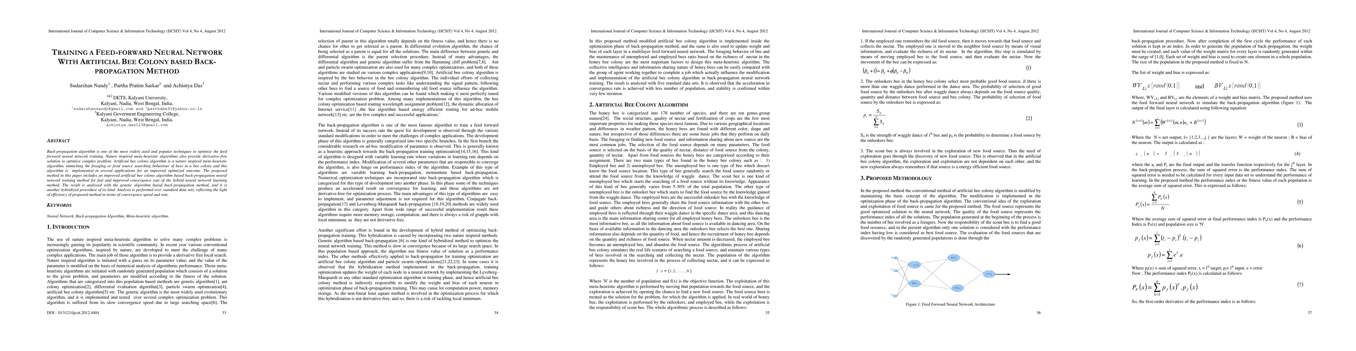 This paper proposes an enhanced feed-forward neural network training method using an artificial bee colony algorithm combined with backpropagation, aiming for faster convergence. The method is compared against a genetic algorithm-based backpropagation method, demonstrating improved efficiency in terms of convergence speed and accuracy on standard datasets.