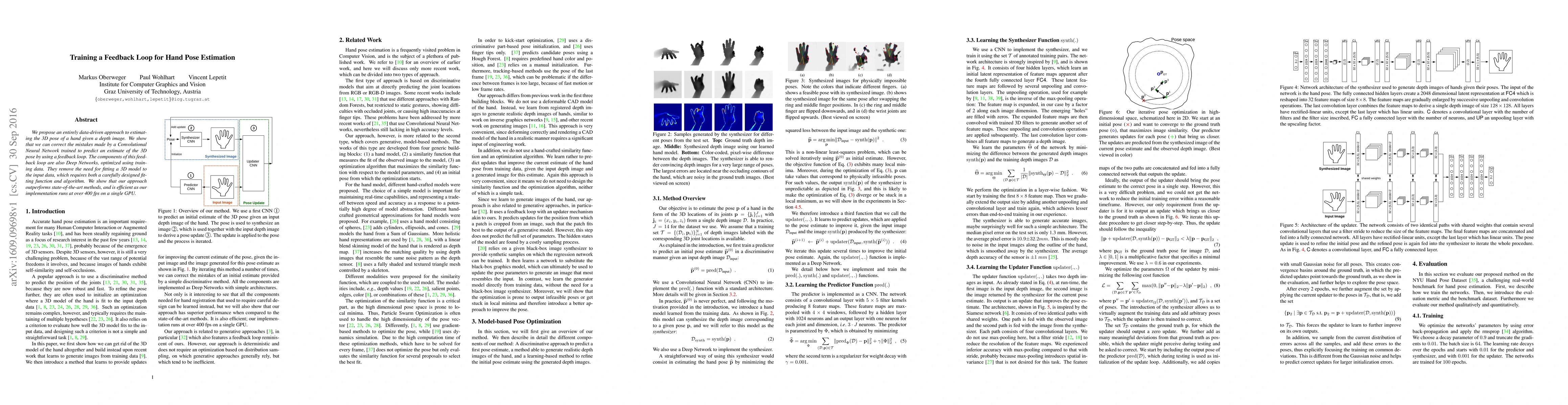 This paper introduces a data-driven method for 3D hand pose estimation using depth images, employing a feedback loop of deep networks to correct errors without requiring 3D model fitting. The proposed approach outperforms existing methods and achieves high efficiency, running at over 400 fps on a single GPU.