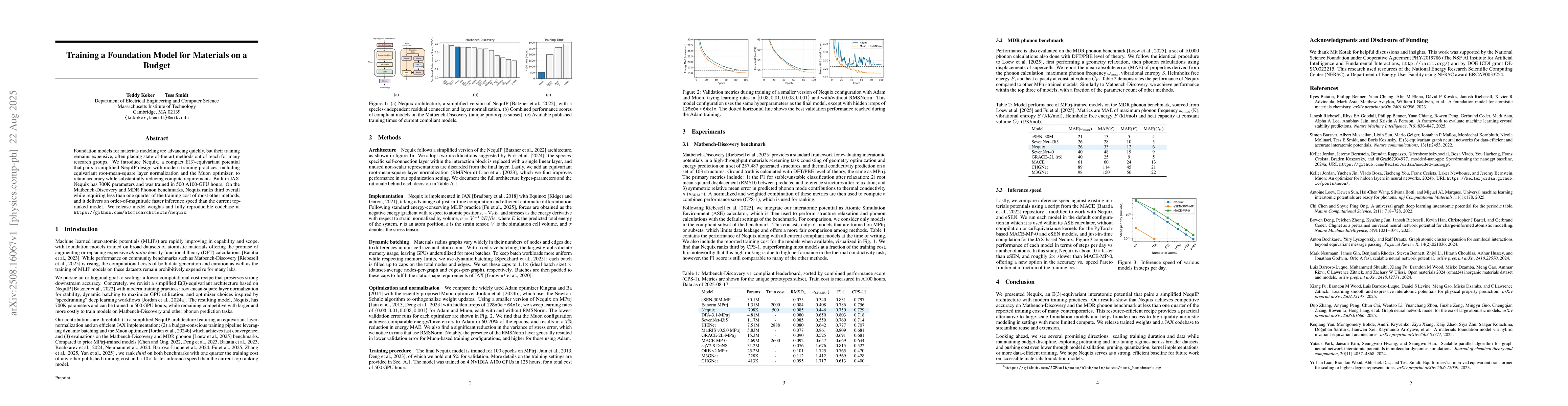 Foundation models for materials modeling are advancing quickly, but their training remains expensive, often placing state-of-the-art methods out of reach for many research groups. We introduce Nequix, a compact E(3)-equivariant potential that pairs a simplified NequIP design with modern training practices, including equivariant root-mean-square layer normalization and the Muon optimizer, to retain accuracy while substantially reducing compute requirements. Built in JAX, Nequix has 700K parameters and was trained in 500 A100-GPU hours. On the Matbench-Discovery and MDR Phonon benchmarks, Nequix ranks third overall while requiring less than one quarter of the training cost of most other methods, and it delivers an order-of-magnitude faster inference speed than the current top-ranked model. We release model weights and fully reproducible codebase at https://github.com/atomicarchitects/nequix
