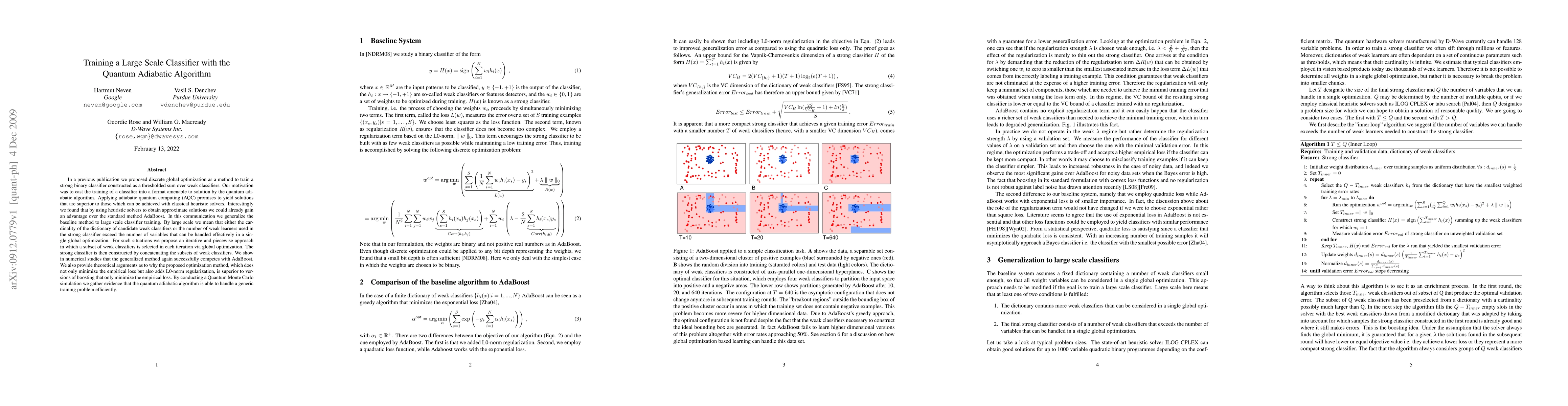 In a previous publication we proposed discrete global optimization as a method to train a strong binary classifier constructed as a thresholded sum over weak classifiers. Our motivation was to cast the training of a classifier into a format amenable to solution by the quantum adiabatic algorithm. Applying adiabatic quantum computing (AQC) promises to yield solutions that are superior to those which can be achieved with classical heuristic solvers. Interestingly we found that by using heuristic solvers to obtain approximate solutions we could already gain an advantage over the standard method AdaBoost. In this communication we generalize the baseline method to large scale classifier training. By large scale we mean that either the cardinality of the dictionary of candidate weak classifiers or the number of weak learners used in the strong classifier exceed the number of variables that can be handled effectively in a single global optimization. For such situations we propose an iterative and piecewise approach in which a subset of weak classifiers is selected in each iteration via global optimization. The strong classifier is then constructed by concatenating the subsets of weak classifiers. We show in numerical studies that the generalized method again successfully competes with AdaBoost. We also provide theoretical arguments as to why the proposed optimization method, which does not only minimize the empirical loss but also adds L0-norm regularization, is superior to versions of boosting that only minimize the empirical loss. By conducting a Quantum Monte Carlo simulation we gather evidence that the quantum adiabatic algorithm is able to handle a generic training problem efficiently.