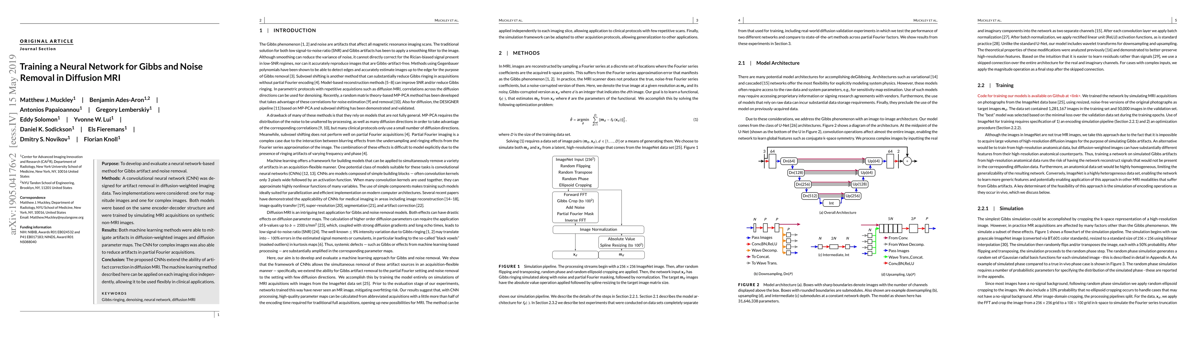 This paper introduces a convolutional neural network (CNN) designed to remove Gibbs artifacts and noise from diffusion MRI data, with separate implementations for magnitude and complex images. Both models effectively reduce artifacts in diffusion-weighted images and parameter maps, with the complex image CNN also improving partial Fourier acquisitions.