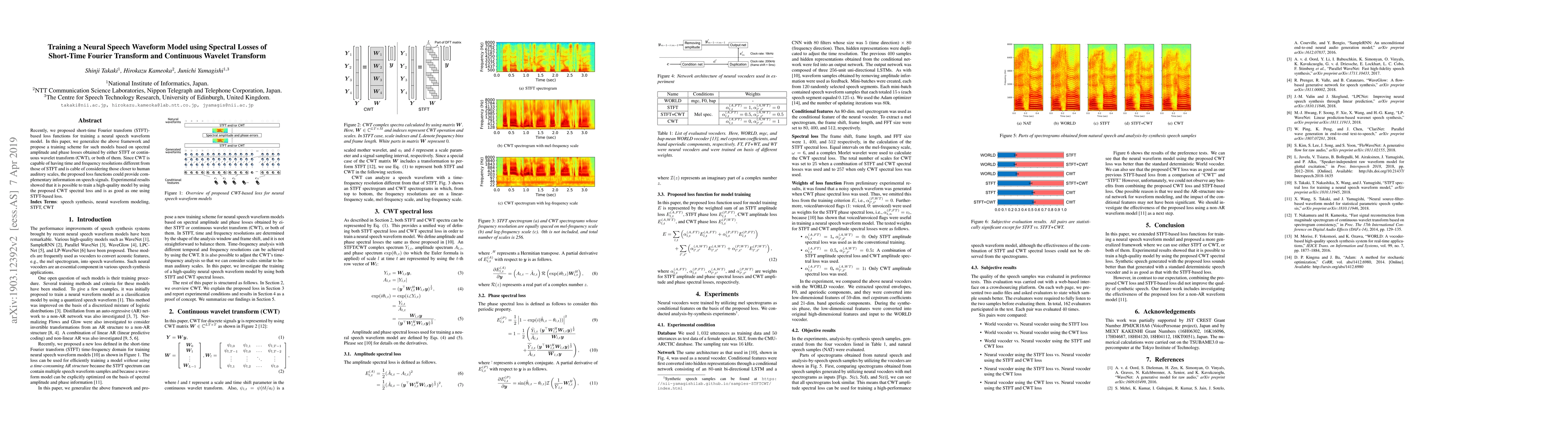 Recently, we proposed short-time Fourier transform (STFT)-based loss functions for training a neural speech waveform model. In this paper, we generalize the above framework and propose a training scheme for such models based on spectral amplitude and phase losses obtained by either STFT or continuous wavelet transform (CWT), or both of them. Since CWT is capable of having time and frequency resolutions different from those of STFT and is cable of considering those closer to human auditory scales, the proposed loss functions could provide complementary information on speech signals. Experimental results showed that it is possible to train a high-quality model by using the proposed CWT spectral loss and is as good as one using STFT-based loss.