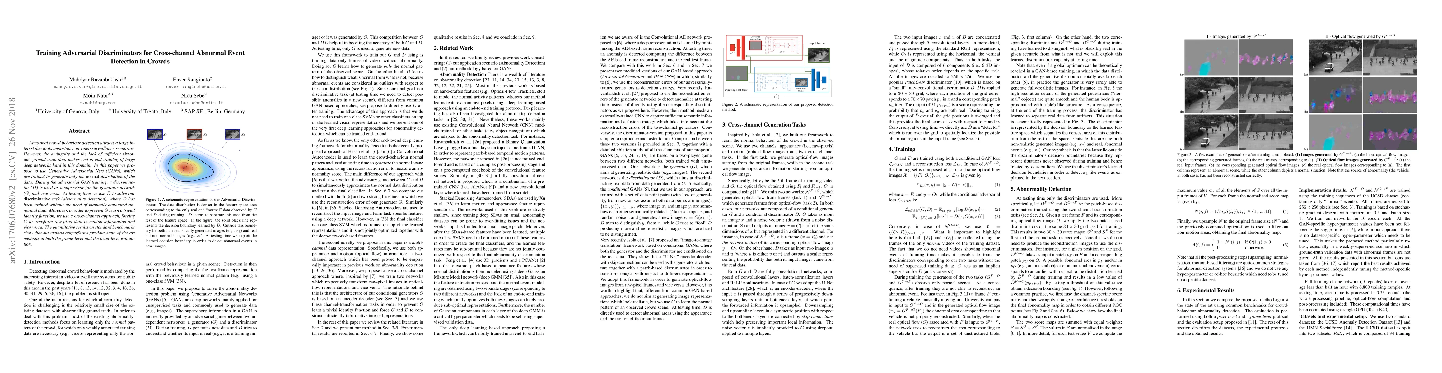 This paper proposes using Generative Adversarial Networks (GANs) to detect abnormal crowd behavior in video surveillance without requiring manually-annotated abnormal data. The discriminator, trained to distinguish normal data, is used for abnormality detection, achieving superior performance compared to previous methods.
