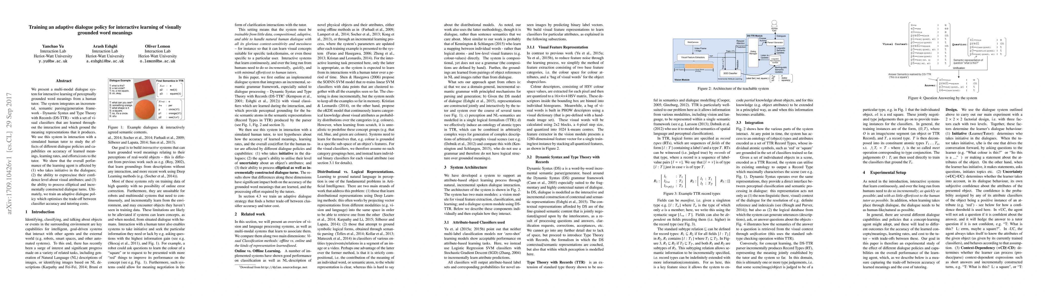 This paper develops a multi-modal dialogue system that learns visually grounded word meanings from a human tutor, integrating semantic parsing with visual classifiers. The system's performance is optimized through an adaptive dialogue policy that balances classifier accuracy and tutoring costs, influenced by dialogue initiative, confidence expression, and handling of elliptical dialogue.