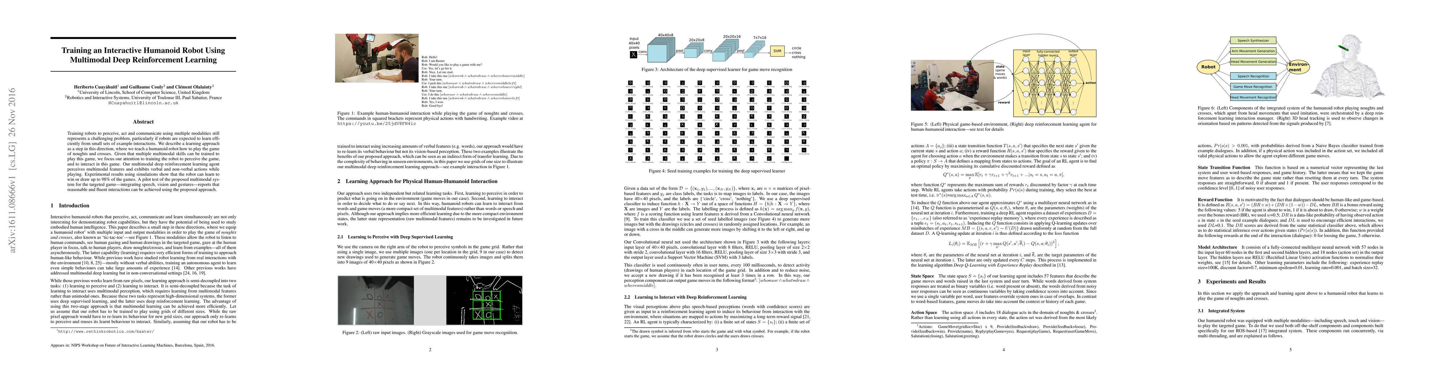 This paper presents a multimodal deep reinforcement learning approach to train a humanoid robot to play noughts and crosses, integrating speech, vision, and gestures. Experimental results show the robot can win or draw up to 98% of games, demonstrating effective multimodal interaction and learning from small interaction examples.
