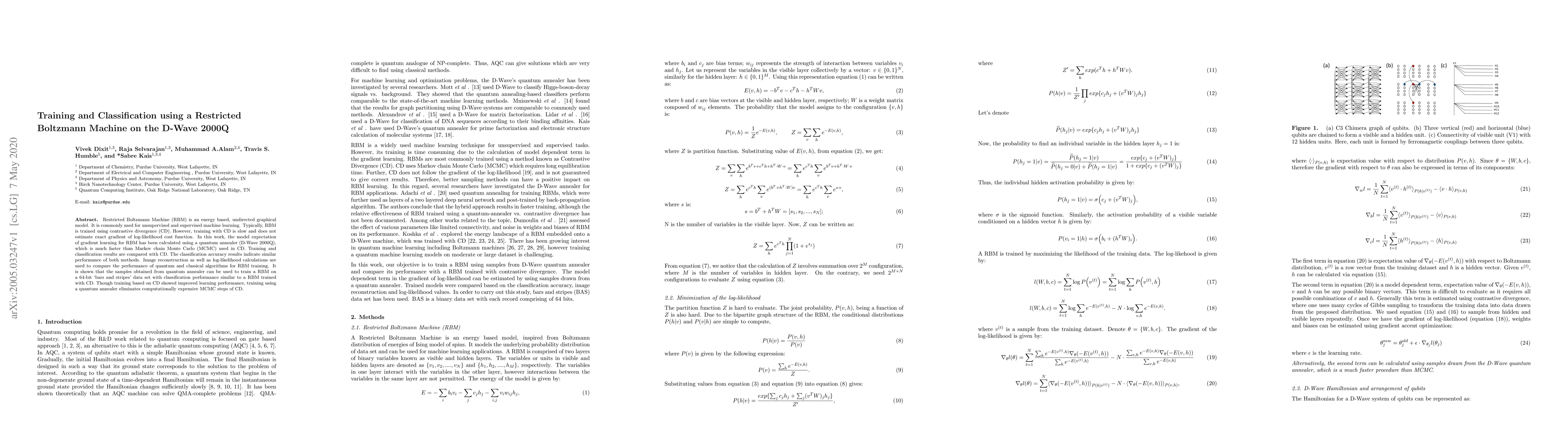 This research paper explores using a quantum annealer to train Restricted Boltzmann Machines, achieving similar classification accuracy as traditional contrastive divergence methods, with significant speed improvements.