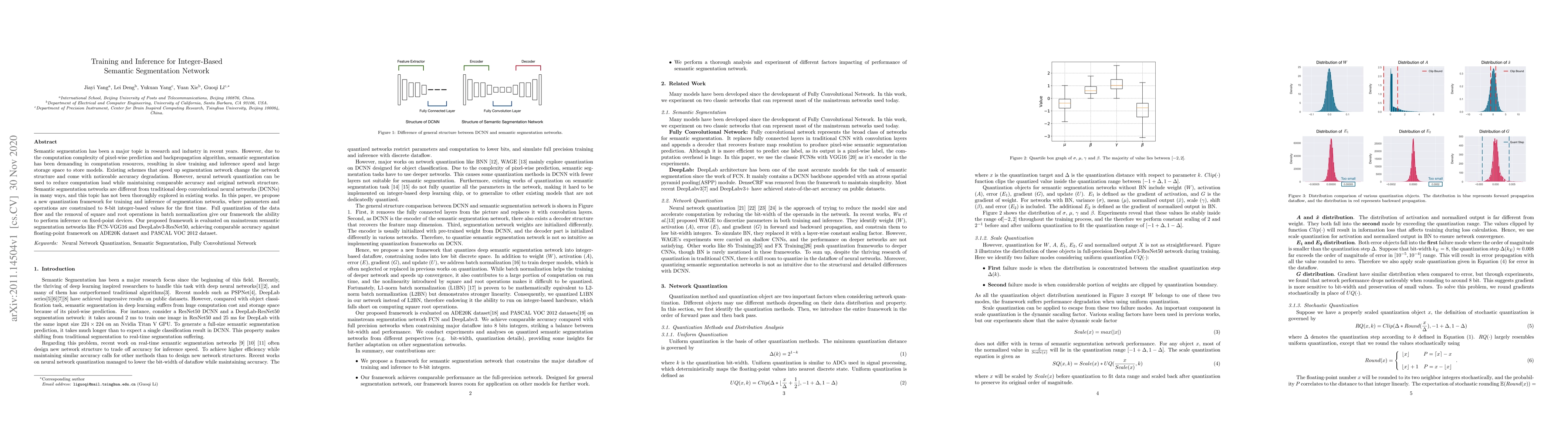 This paper proposes a new quantization framework for training and inference of semantic segmentation networks using 8-bit integer-based values, achieving comparable accuracy on mainstream networks.