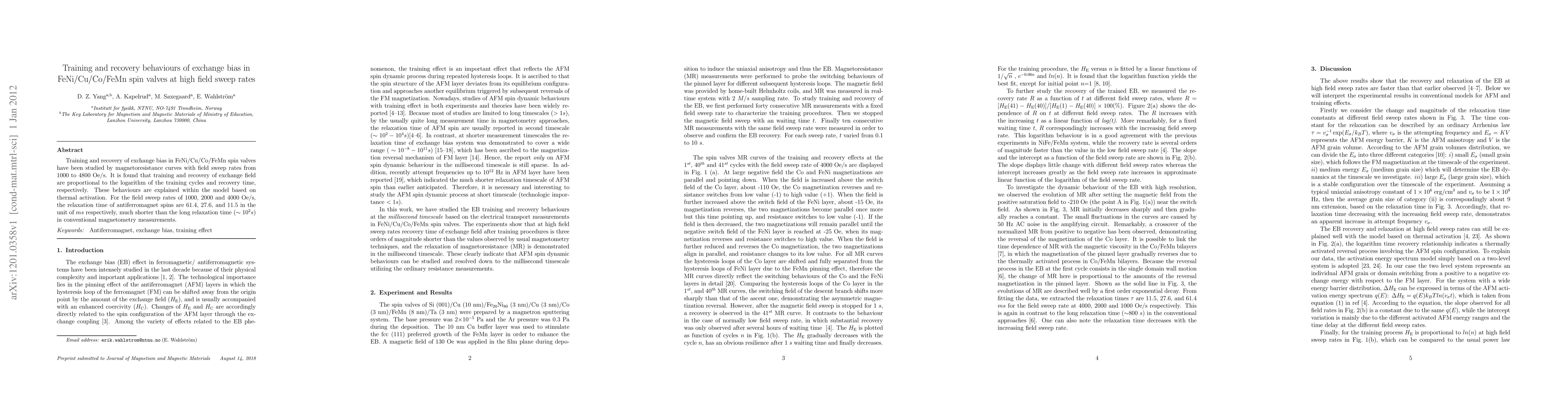 Training and recovery of exchange bias in FeNi/Cu/Co/FeMn spin valves have been studied by magnetoresistance curves with field sweep rates from 1000 to 4800 Oe/s. It is found that training and recovery of exchange field are proportional to the logarithm of the training cycles and recovery time, respectively. These behaviours are explained within the model based on thermal activation. For the field sweep rates of 1000, 2000 and 4000 Oe/s, the relaxation time of antiferromagnet spins are 61.4, 27.6, and 11.5 in the unit of $ms$ respectively, much shorter than the long relaxation time (~10^2 s) in conventional magnetometry measurements.