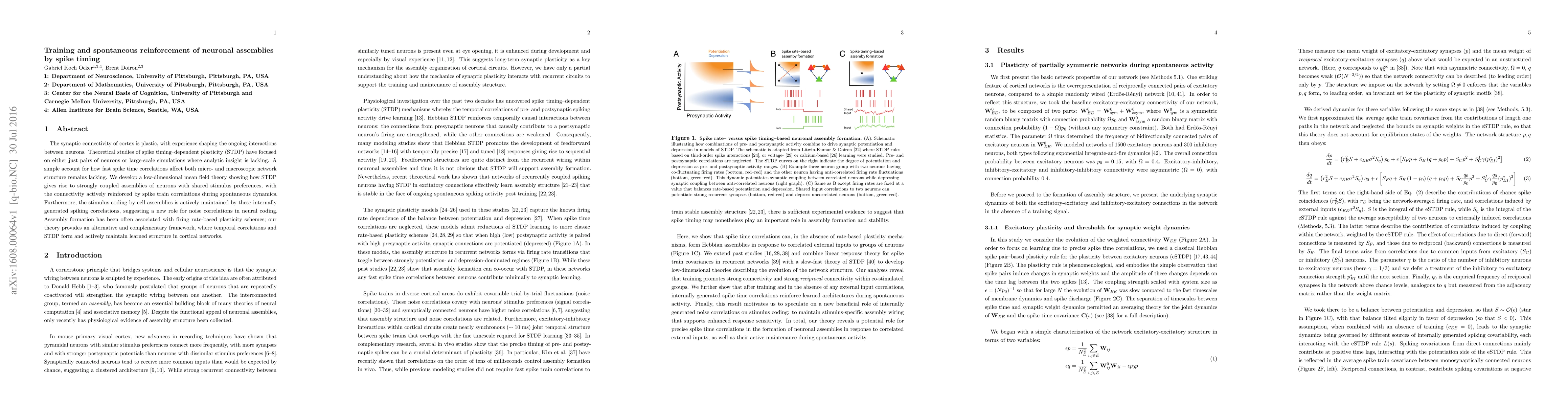 The synaptic connectivity of cortex is plastic, with experience shaping the ongoing interactions between neurons. Theoretical studies of spike timing-dependent plasticity (STDP) have focused on either just pairs of neurons or large-scale simulations where analytic insight is lacking. A simple account for how fast spike time correlations affect both micro- and macroscopic network structure remains lacking. We develop a low-dimensional mean field theory showing how STDP gives rise to strongly coupled assemblies of neurons with shared stimulus preferences, with the connectivity actively reinforced by spike train correlations during spontaneous dynamics. Furthermore, the stimulus coding by cell assemblies is actively maintained by these internally generated spiking correlations, suggesting a new role for noise correlations in neural coding. Assembly formation has often been associated with firing rate-based plasticity schemes; our theory provides an alternative and complementary framework, where temporal correlations and STDP form and actively maintain learned structure in cortical networks.