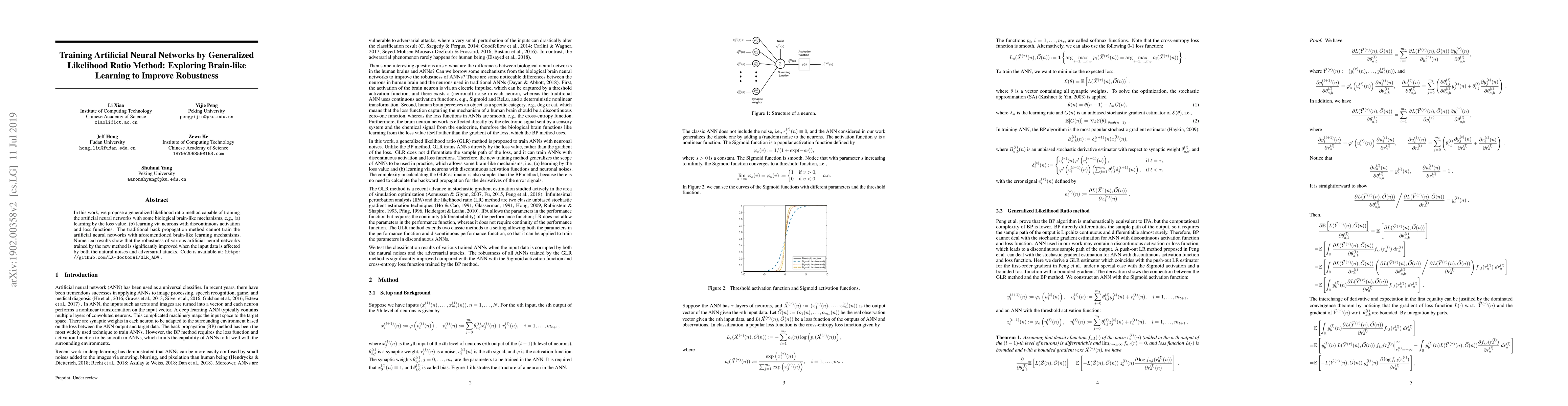 In this work, we propose a generalized likelihood ratio method capable of training the artificial neural networks with some biological brain-like mechanisms,.e.g., (a) learning by the loss value, (b) learning via neurons with discontinuous activation and loss functions. The traditional back propagation method cannot train the artificial neural networks with aforementioned brain-like learning mechanisms. Numerical results show that the robustness of various artificial neural networks trained by the new method is significantly improved when the input data is affected by both the natural noises and adversarial attacks. Code is available: \url{https://github.com/LX-doctorAI/GLR_ADV} .