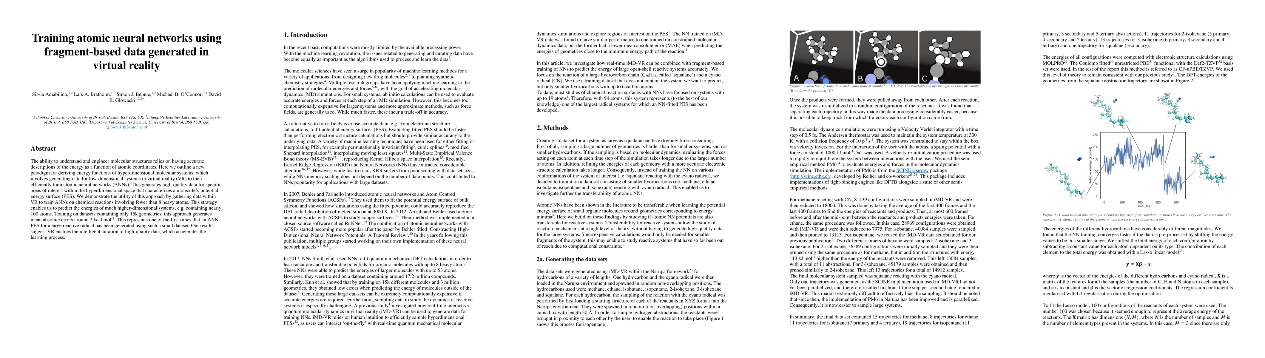The ability to understand and engineer molecular structures relies on having accurate descriptions of the energy as a function of atomic coordinates. Here we outline a new paradigm for deriving energy functions of hyperdimensional molecular systems, which involves generating data for low-dimensional systems in virtual reality (VR) to then efficiently train atomic neural networks (ANNs). This generates high quality data for specific areas of interest within the hyperdimensional space that characterizes a molecule's potential energy surface (PES). We demonstrate the utility of this approach by gathering data within VR to train ANNs on chemical reactions involving fewer than 8 heavy atoms. This strategy enables us to predict the energies of much higher-dimensional systems, e.g. containing nearly 100 atoms. Training on datasets containing only 15K geometries, this approach generates mean absolute errors around 2 kcal/mol. This represents one of the first times that an ANN-PES for a large reactive radical has been generated using such a small dataset. Our results suggest VR enables the intelligent curation of high-quality data, which accelerates the learning process.