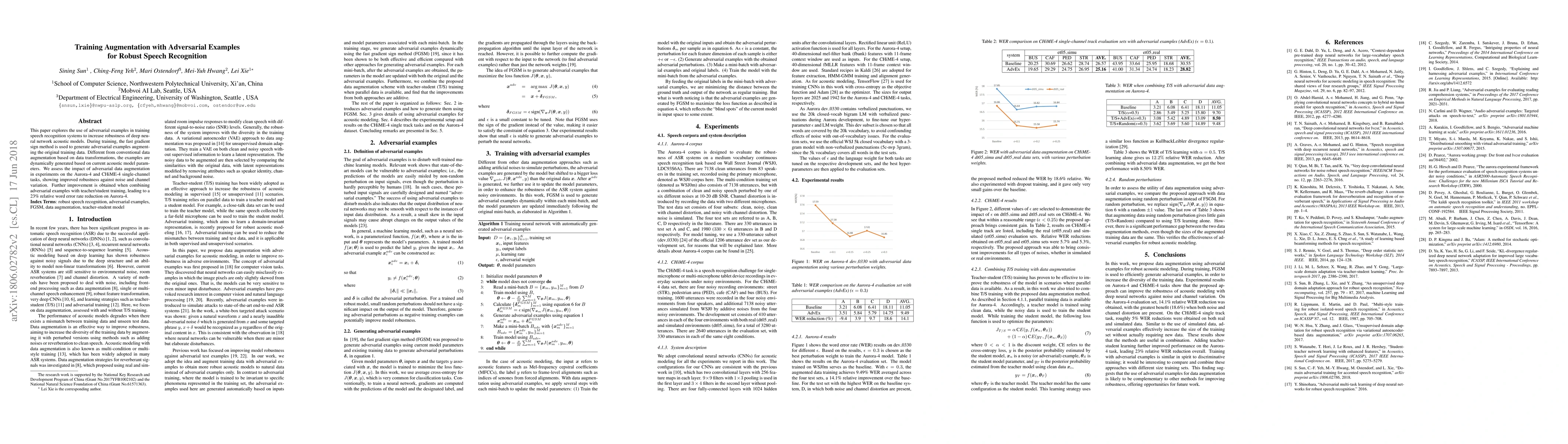 This paper investigates using adversarial examples generated via the fast gradient sign method to augment training data for robust speech recognition, achieving better noise and channel variation resilience. Combining adversarial augmentation with teacher/student training further reduces word error rates by 23% on Aurora-4.