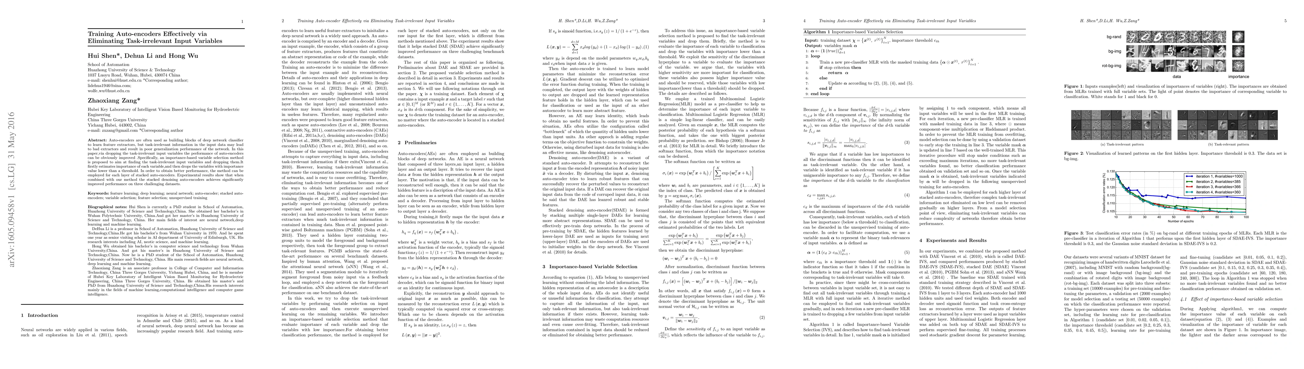 This paper proposes an importance-based variable selection method to eliminate task-irrelevant input variables from auto-encoders, improving their performance. The method estimates variable importance and drops low-importance variables, enhancing stacked auto-encoders' performance on three datasets.
