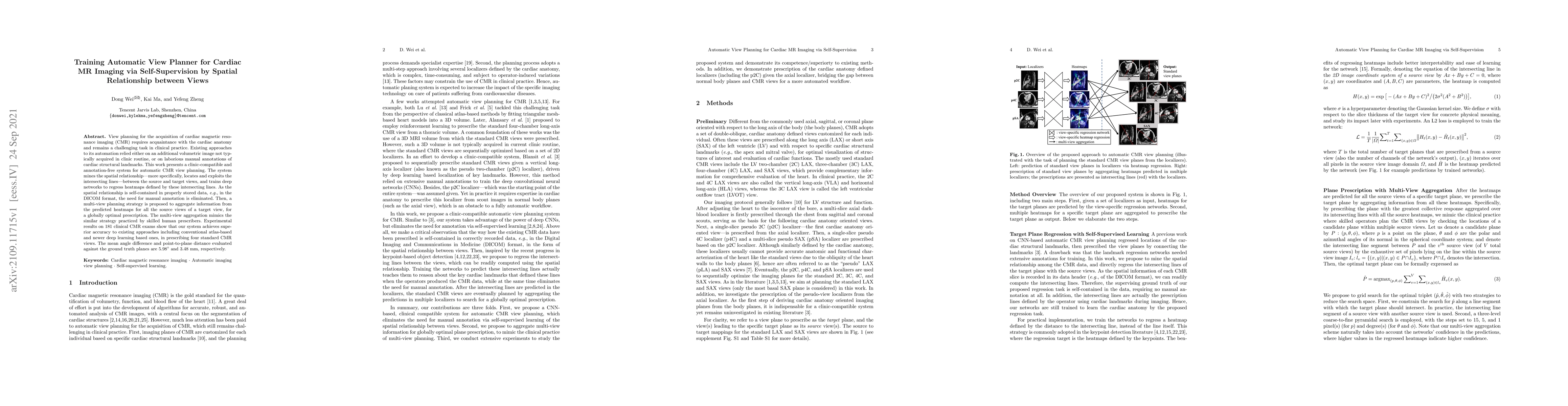 This research introduces an annotation-free system for automatic cardiac MRI view planning, utilizing the spatial relationship between views stored in DICOM format. The method outperforms existing approaches, demonstrating superior accuracy in prescribing standard MRI views, with a mean angle difference of 5.98 degrees and point-to-plane distance of 3.48 mm in experiments on 181 clinical exams.