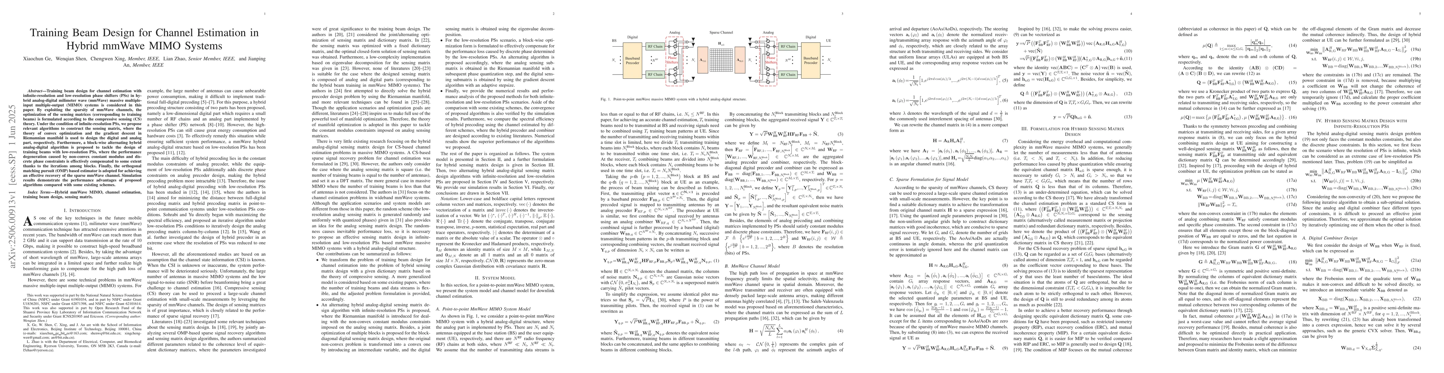 The paper presents novel training beam design algorithms for channel estimation in hybrid mmWave MIMO systems, leveraging compressive sensing theory, convex optimization, and gradient descent on Riemannian manifolds, along with a block-wise alternating approach for low-resolution phase shifters.