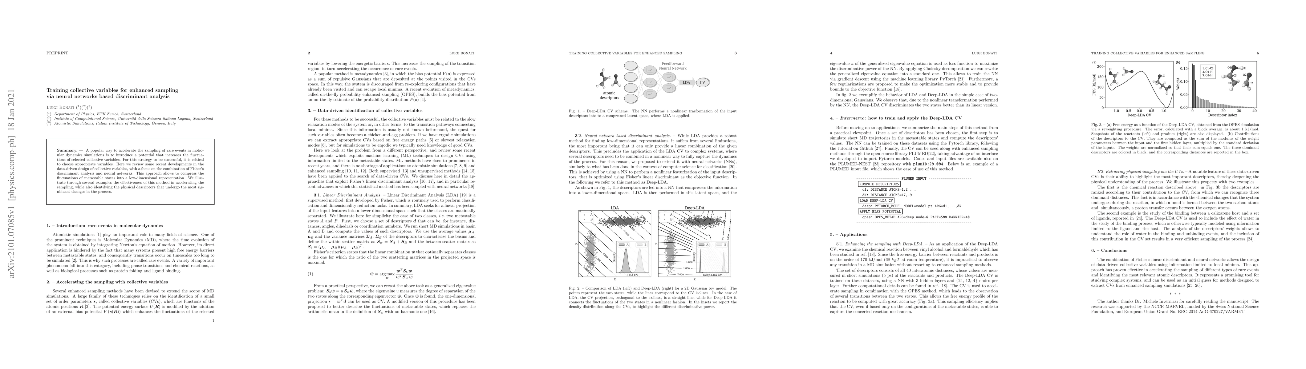 This paper explores the use of neural networks combined with Fisher's discriminant analysis to enhance sampling of rare events in molecular dynamics simulations by identifying optimal collective variables. The method effectively compresses metastable state fluctuations into a low-dimensional representation, significantly accelerating sampling and revealing key physical descriptors.