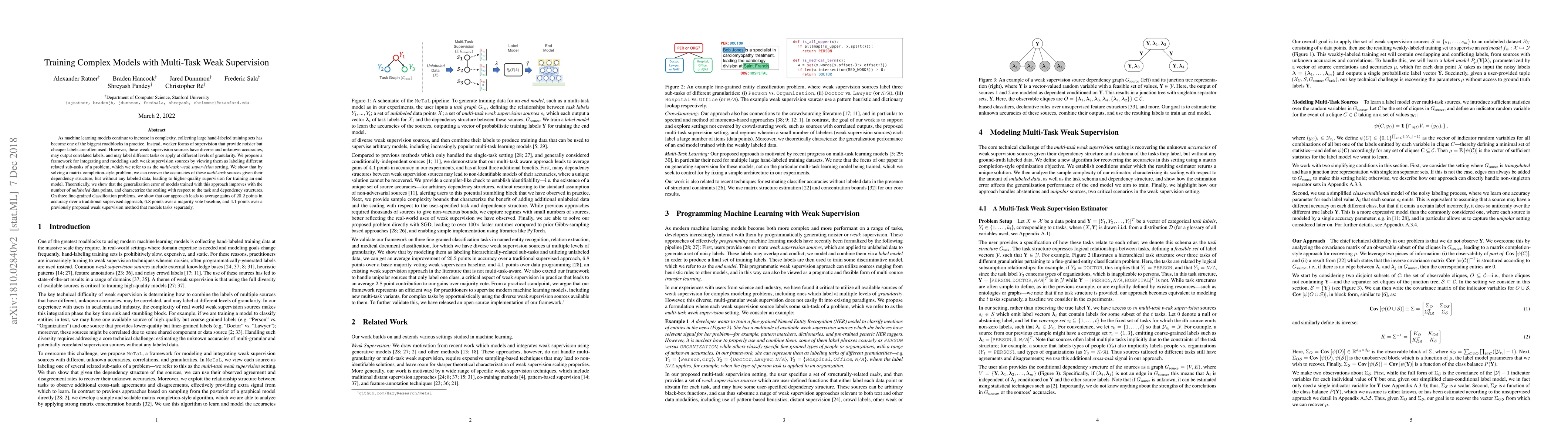 This paper proposes a framework for training complex models using multi-task weak supervision, addressing the challenge of noisy, cheaper labels by modeling them as related sub-tasks. The approach improves generalization error and achieves significant accuracy gains over traditional supervised and other weak supervision methods.