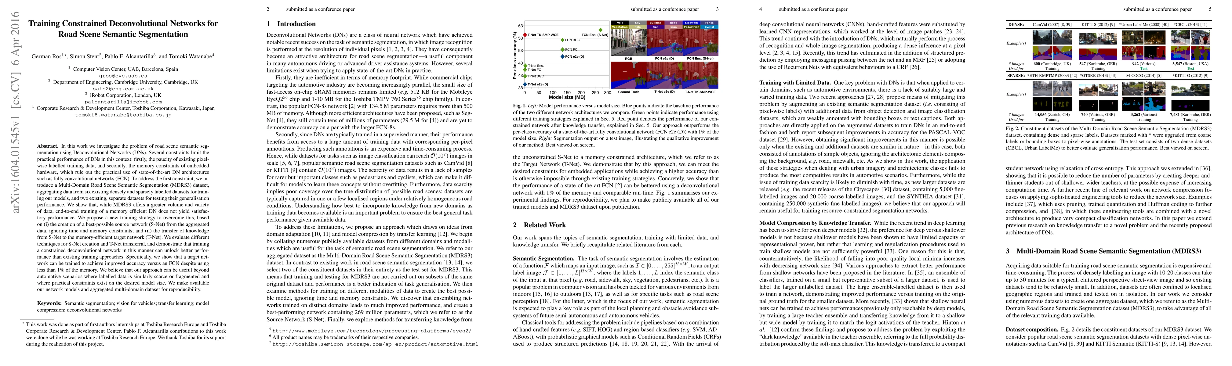 In this work we investigate the problem of road scene semantic segmentation using Deconvolutional Networks (DNs). Several constraints limit the practical performance of DNs in this context: firstly, the paucity of existing pixel-wise labelled training data, and secondly, the memory constraints of embedded hardware, which rule out the practical use of state-of-the-art DN architectures such as fully convolutional networks (FCN). To address the first constraint, we introduce a Multi-Domain Road Scene Semantic Segmentation (MDRS3) dataset, aggregating data from six existing densely and sparsely labelled datasets for training our models, and two existing, separate datasets for testing their generalisation performance. We show that, while MDRS3 offers a greater volume and variety of data, end-to-end training of a memory efficient DN does not yield satisfactory performance. We propose a new training strategy to overcome this, based on (i) the creation of a best-possible source network (S-Net) from the aggregated data, ignoring time and memory constraints; and (ii) the transfer of knowledge from S-Net to the memory-efficient target network (T-Net). We evaluate different techniques for S-Net creation and T-Net transferral, and demonstrate that training a constrained deconvolutional network in this manner can unlock better performance than existing training approaches. Specifically, we show that a target network can be trained to achieve improved accuracy versus an FCN despite using less than 1\% of the memory. We believe that our approach can be useful beyond automotive scenarios where labelled data is similarly scarce or fragmented and where practical constraints exist on the desired model size. We make available our network models and aggregated multi-domain dataset for reproducibility.