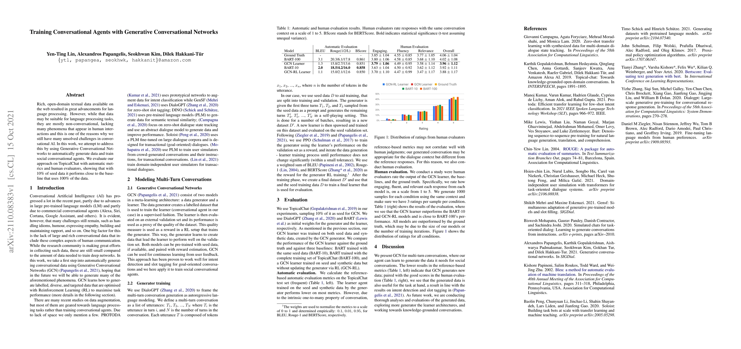 This paper explores the use of Generative Conversational Networks to create conversational training data, aiming to improve conversational agents. The approach is evaluated on TopicalChat, demonstrating comparable performance with only 10% of the seed data compared to 100%, indicating potential for efficient training.