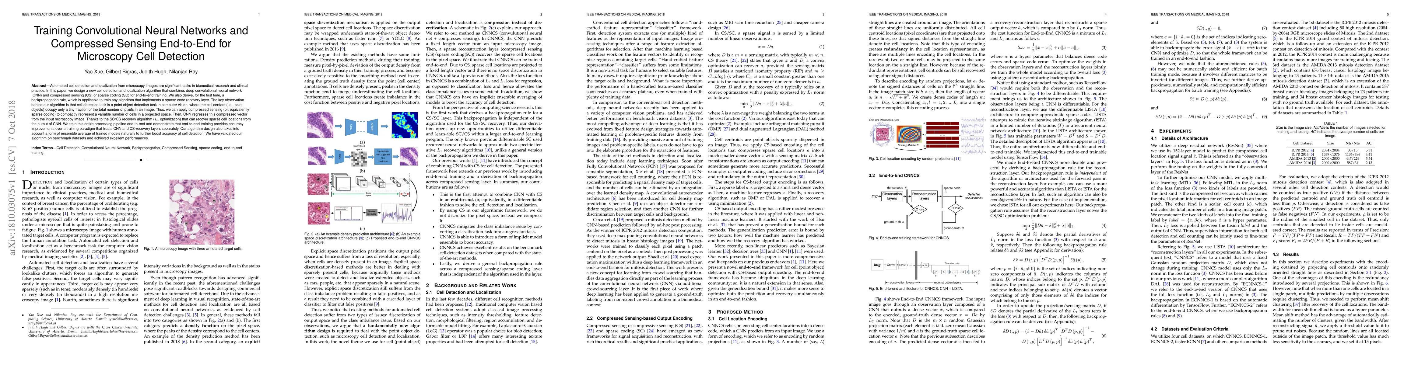 This paper proposes an end-to-end training algorithm for automated cell detection in microscopy images, combining convolutional neural networks (CNN) with compressed sensing (CS) and sparse coding (SC). The method leverages CS to compactly represent cell locations, enabling CNN to regress this compressed vector, and demonstrates improved accuracy over separate training of CNN and CS-recovery layers.