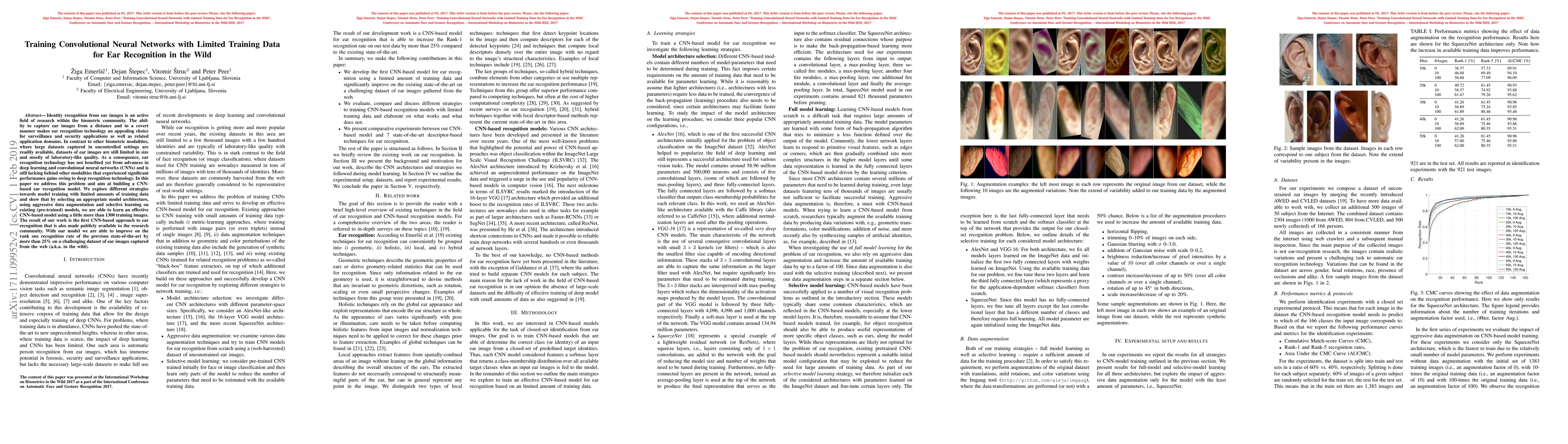 This paper develops a CNN-based ear recognition model using limited training data, employing data augmentation and selective learning from pre-trained models. The approach achieves a 25% improvement over the previous state-of-the-art on a challenging dataset of ear images captured in uncontrolled settings.