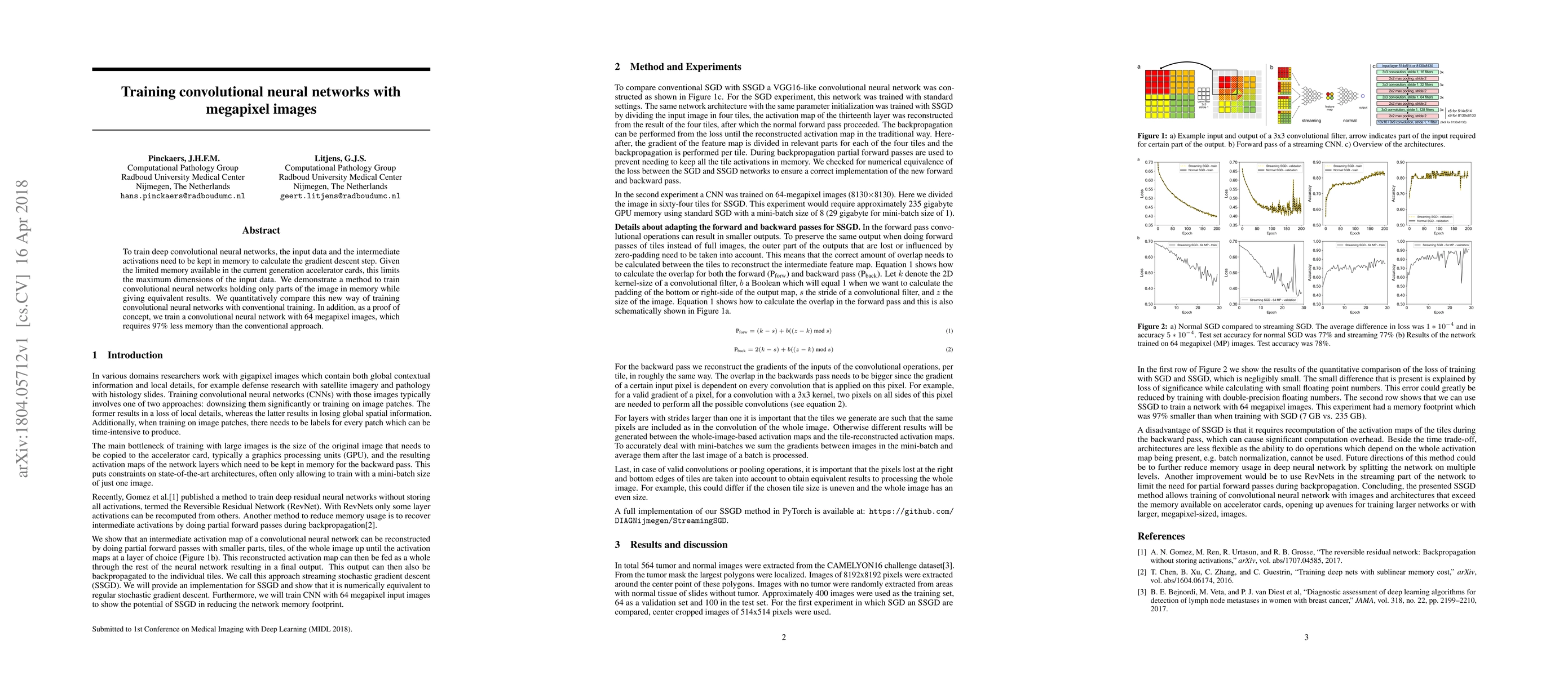 To train deep convolutional neural networks, the input data and the intermediate activations need to be kept in memory to calculate the gradient descent step. Given the limited memory available in the current generation accelerator cards, this limits the maximum dimensions of the input data. We demonstrate a method to train convolutional neural networks holding only parts of the image in memory while giving equivalent results. We quantitatively compare this new way of training convolutional neural networks with conventional training. In addition, as a proof of concept, we train a convolutional neural network with 64 megapixel images, which requires 97% less memory than the conventional approach.