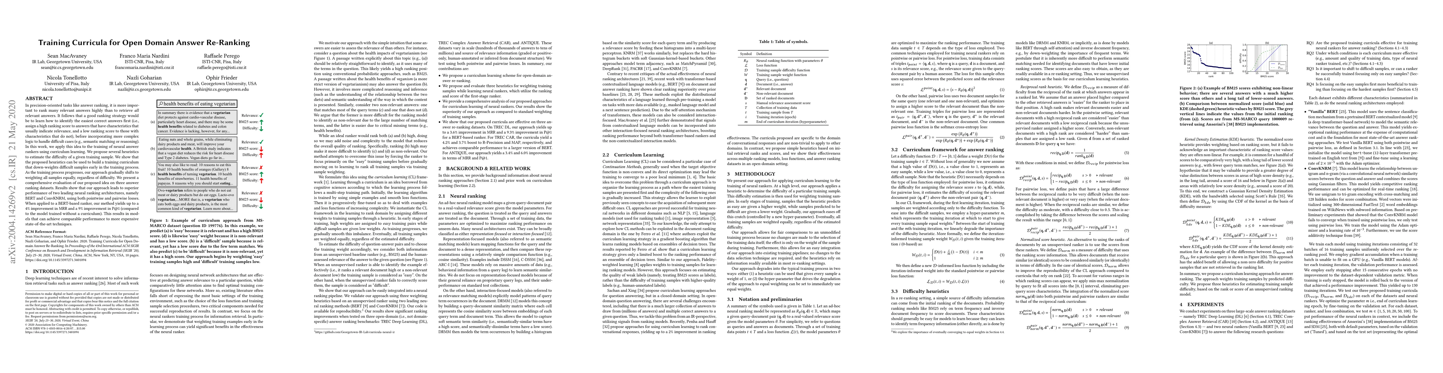 In precision-oriented tasks like answer ranking, it is more important to rank many relevant answers highly than to retrieve all relevant answers. It follows that a good ranking strategy would be to learn how to identify the easiest correct answers first (i.e., assign a high ranking score to answers that have characteristics that usually indicate relevance, and a low ranking score to those with characteristics that do not), before incorporating more complex logic to handle difficult cases (e.g., semantic matching or reasoning). In this work, we apply this idea to the training of neural answer rankers using curriculum learning. We propose several heuristics to estimate the difficulty of a given training sample. We show that the proposed heuristics can be used to build a training curriculum that down-weights difficult samples early in the training process. As the training process progresses, our approach gradually shifts to weighting all samples equally, regardless of difficulty. We present a comprehensive evaluation of our proposed idea on three answer ranking datasets. Results show that our approach leads to superior performance of two leading neural ranking architectures, namely BERT and ConvKNRM, using both pointwise and pairwise losses. When applied to a BERT-based ranker, our method yields up to a 4% improvement in MRR and a 9% improvement in P@1 (compared to the model trained without a curriculum). This results in models that can achieve comparable performance to more expensive state-of-the-art techniques.
