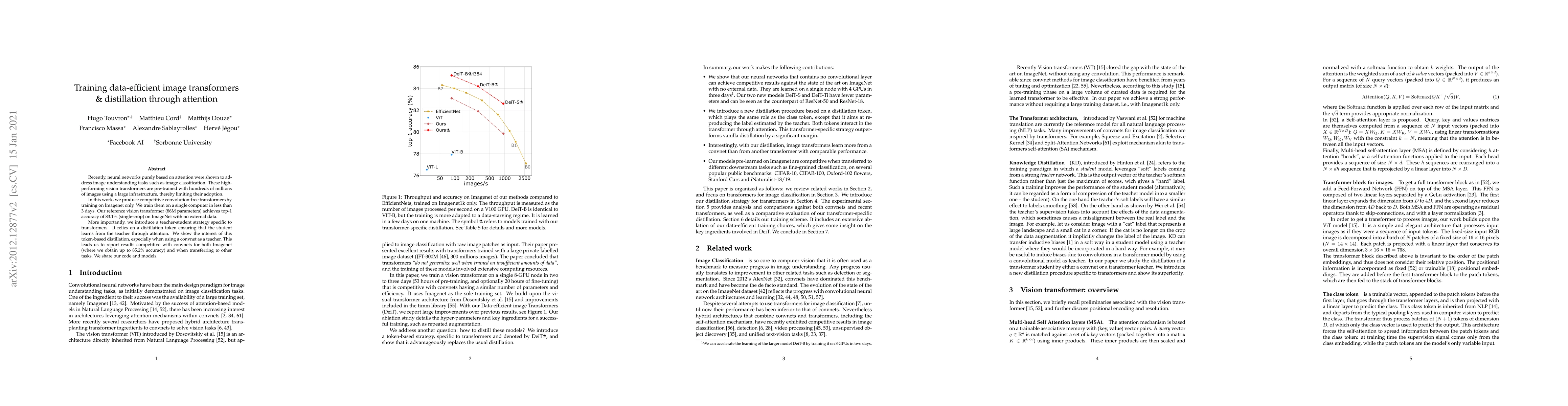 This paper presents a method to train efficient, convolution-free transformers on ImageNet alone, achieving 83.1% top-1 accuracy in less than 3 days. It introduces a distillation strategy using a distillation token, which enhances learning through attention, leading to competitive results comparable to convolutional networks.