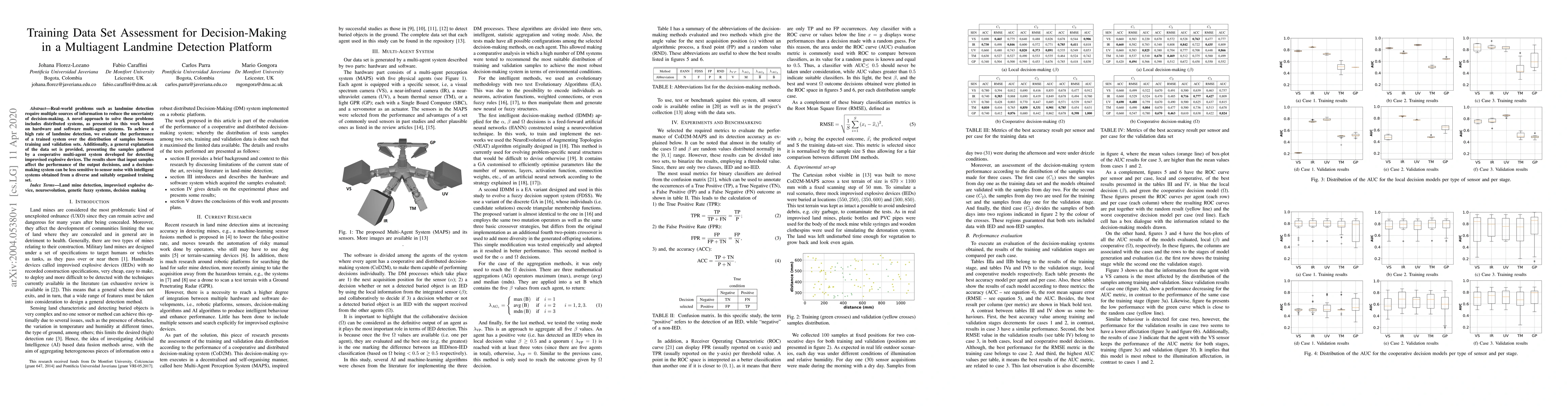 Real-world problems such as landmine detection require multiple sources of information to reduce the uncertainty of decision-making. A novel approach to solve these problems includes distributed systems, as presented in this work based on hardware and software multi-agent systems. To achieve a high rate of landmine detection, we evaluate the performance of a trained system over the distribution of samples between training and validation sets. Additionally, a general explanation of the data set is provided, presenting the samples gathered by a cooperative multi-agent system developed for detecting improvised explosive devices. The results show that input samples affect the performance of the output decisions, and a decision-making system can be less sensitive to sensor noise with intelligent systems obtained from a diverse and suitably organised training set.