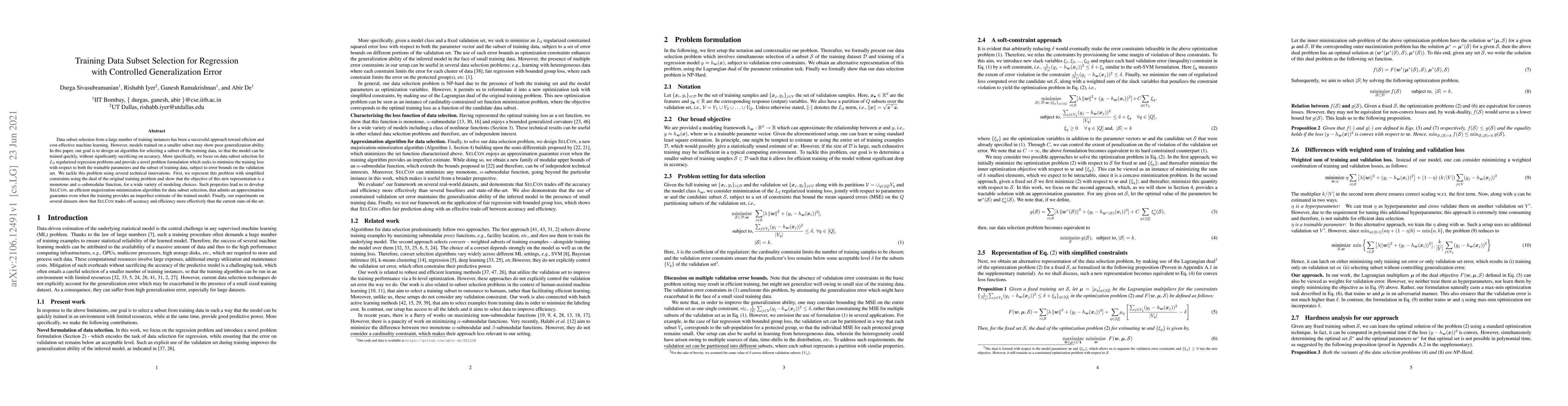 This paper proposes an algorithm, SELCON, for selecting a subset of training data for L2 regularized regression to balance training speed and model accuracy, using a novel problem formulation and optimization techniques. Experiments demonstrate that SELCON outperforms existing methods in this trade-off.