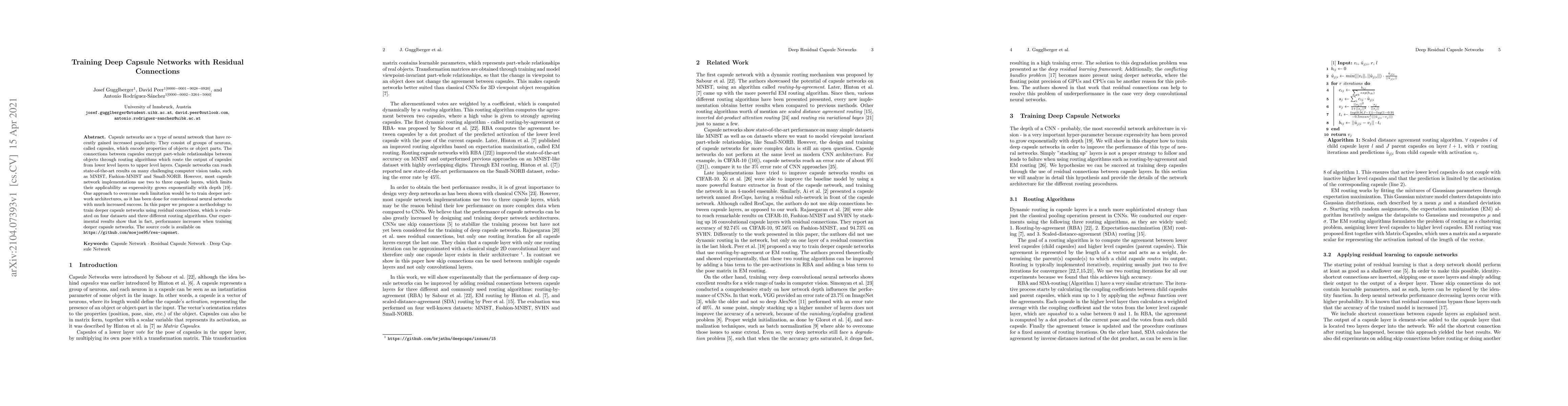 This paper proposes a methodology for training deeper capsule networks using residual connections, demonstrating improved performance on four datasets and three routing algorithms. The results indicate that deeper architectures can enhance expressivity and performance, with source code available for reproducibility.