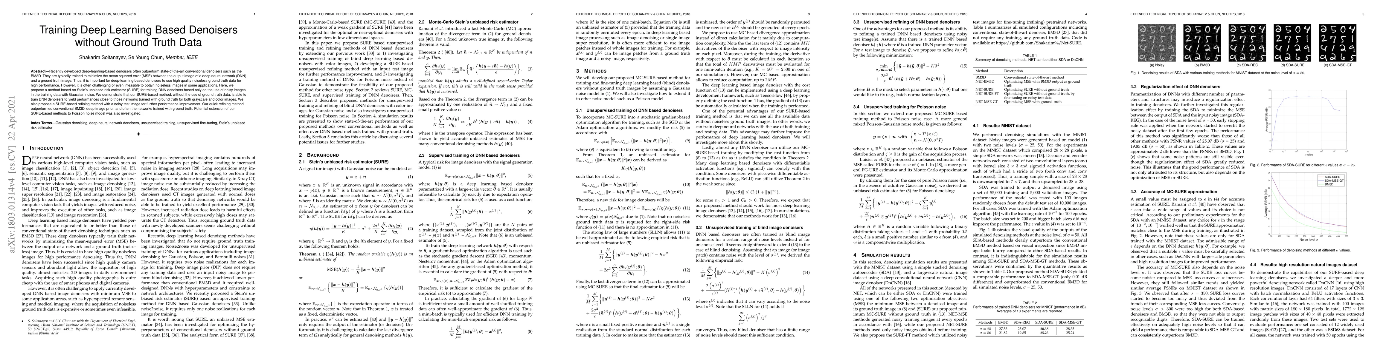 This paper proposes a method to train deep-learning-based denoisers using only noisy images and Stein's unbiased risk estimator (SURE) instead of high-quality ground truth data, achieving performance close to that of networks trained with ground truth. The SURE-based refining method further improves performance, outperforming conventional denoisers and networks trained with ground truth.
