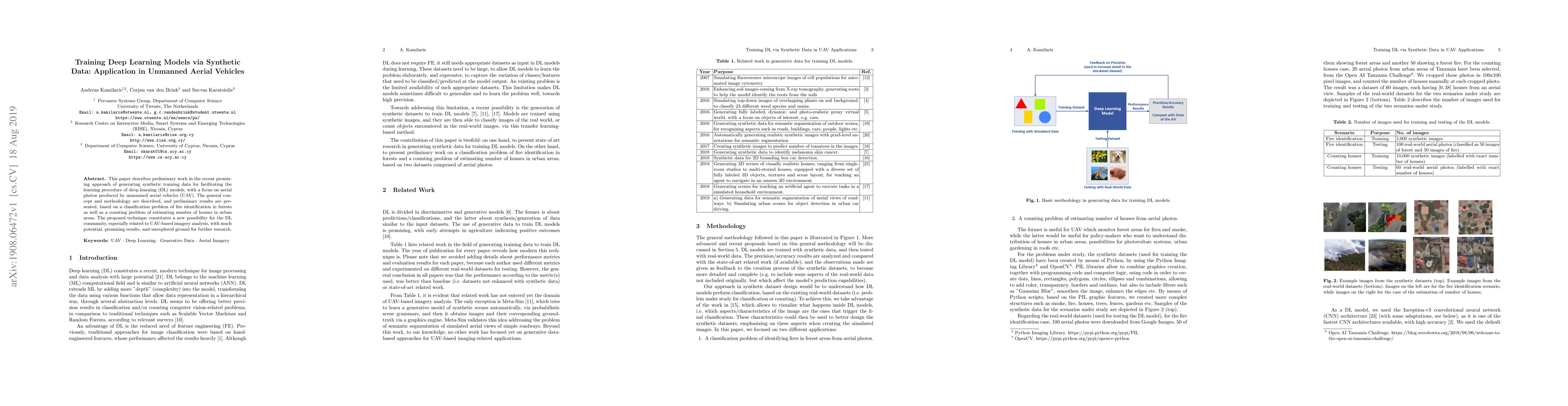 This paper describes preliminary work in the recent promising approach of generating synthetic training data for facilitating the learning procedure of deep learning (DL) models, with a focus on aerial photos produced by unmanned aerial vehicles (UAV). The general concept and methodology are described, and preliminary results are presented, based on a classification problem of fire identification in forests as well as a counting problem of estimating number of houses in urban areas. The proposed technique constitutes a new possibility for the DL community, especially related to UAV-based imagery analysis, with much potential, promising results, and unexplored ground for further research.