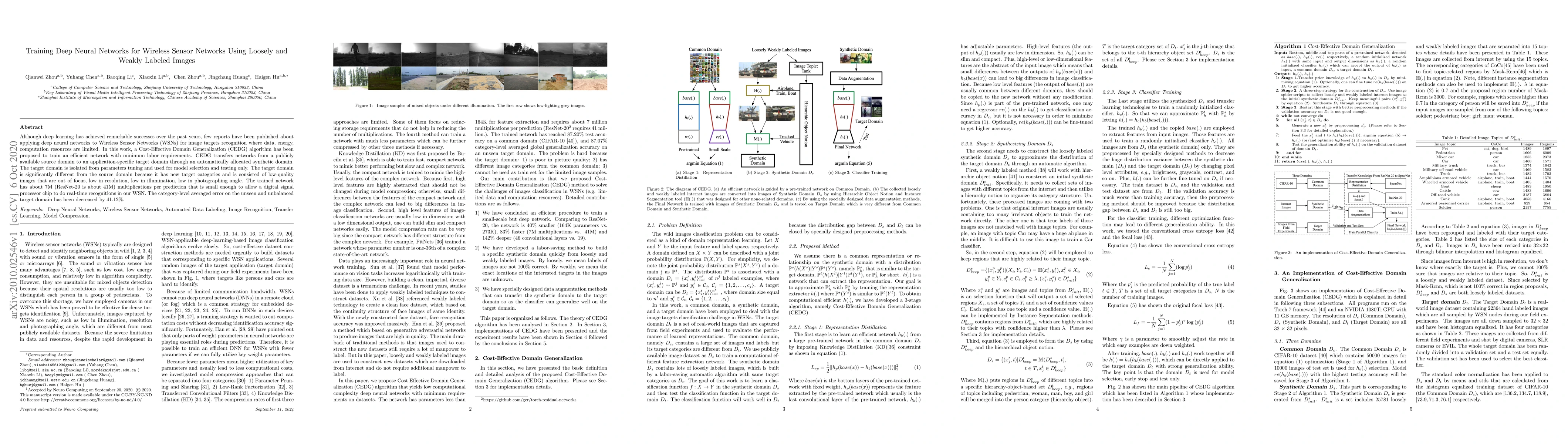 Although deep learning has achieved remarkable successes over the past years, few reports have been published about applying deep neural networks to Wireless Sensor Networks (WSNs) for image targets recognition where data, energy, computation resources are limited. In this work, a Cost-Effective Domain Generalization (CEDG) algorithm has been proposed to train an efficient network with minimum labor requirements. CEDG transfers networks from a publicly available source domain to an application-specific target domain through an automatically allocated synthetic domain. The target domain is isolated from parameters tuning and used for model selection and testing only. The target domain is significantly different from the source domain because it has new target categories and is consisted of low-quality images that are out of focus, low in resolution, low in illumination, low in photographing angle. The trained network has about 7M (ResNet-20 is about 41M) multiplications per prediction that is small enough to allow a digital signal processor chip to do real-time recognitions in our WSN. The category-level averaged error on the unseen and unbalanced target domain has been decreased by 41.12%.