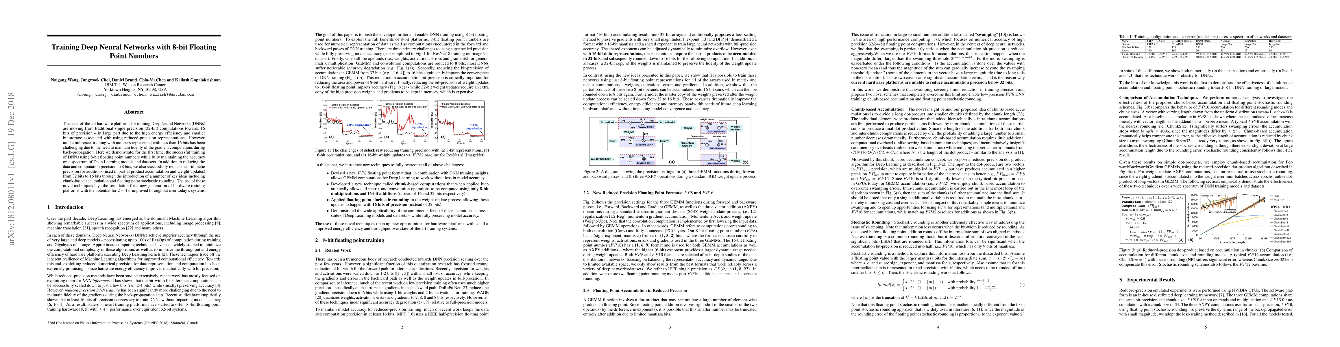 This paper demonstrates the successful training of Deep Neural Networks using 8-bit floating point numbers, maintaining accuracy across various models and datasets. It introduces innovative techniques like chunk-based accumulation and floating point stochastic rounding, paving the way for hardware platforms with significantly improved training throughput.