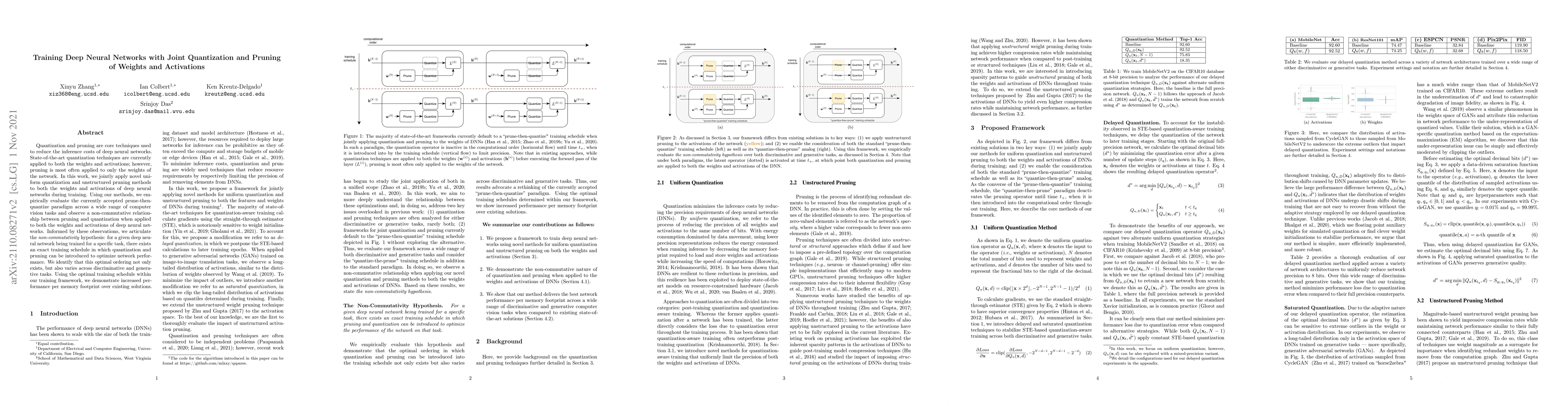 Quantization and pruning are core techniques used to reduce the inference costs of deep neural networks. State-of-the-art quantization techniques are currently applied to both the weights and activations; however, pruning is most often applied to only the weights of the network. In this work, we jointly apply novel uniform quantization and unstructured pruning methods to both the weights and activations of deep neural networks during training. Using our methods, we empirically evaluate the currently accepted prune-then-quantize paradigm across a wide range of computer vision tasks and observe a non-commutative nature when applied to both the weights and activations of deep neural networks. Informed by these observations, we articulate the non-commutativity hypothesis: for a given deep neural network being trained for a specific task, there exists an exact training schedule in which quantization and pruning can be introduced to optimize network performance. We identify that this optimal ordering not only exists, but also varies across discriminative and generative tasks. Using the optimal training schedule within our training framework, we demonstrate increased performance per memory footprint over existing solutions.