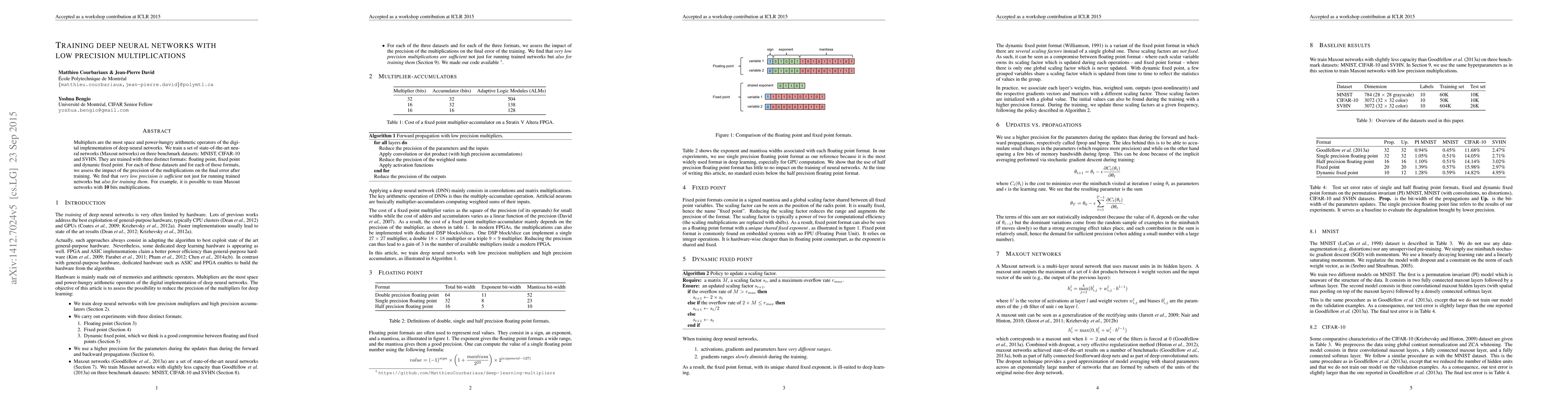 Multipliers are the most space and power-hungry arithmetic operators of the digital implementation of deep neural networks. We train a set of state-of-the-art neural networks (Maxout networks) on three benchmark datasets: MNIST, CIFAR-10 and SVHN. They are trained with three distinct formats: floating point, fixed point and dynamic fixed point. For each of those datasets and for each of those formats, we assess the impact of the precision of the multiplications on the final error after training. We find that very low precision is sufficient not just for running trained networks but also for training them. For example, it is possible to train Maxout networks with 10 bits multiplications.