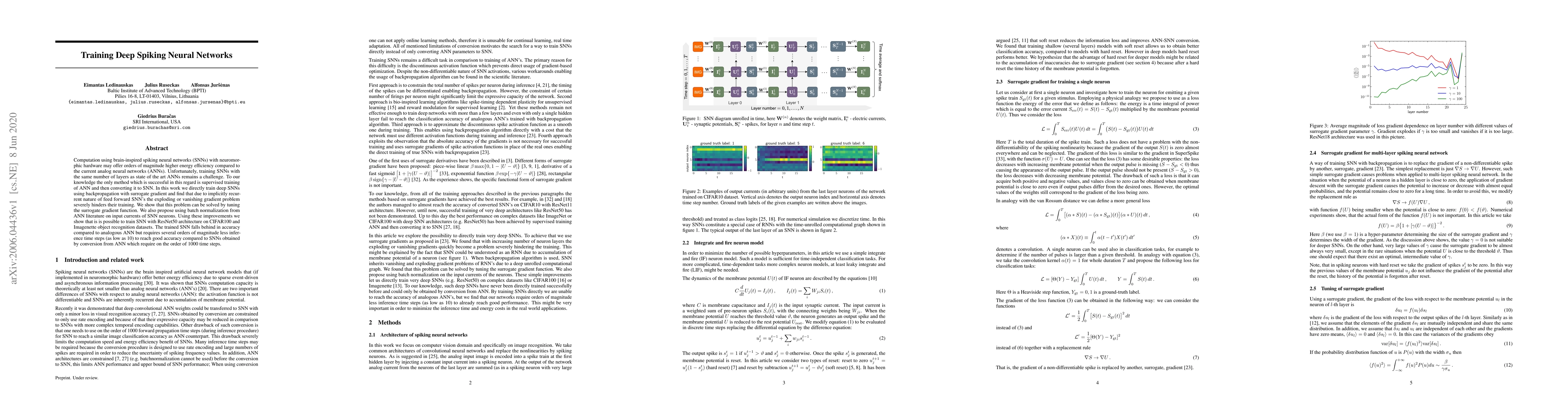 This paper presents a method for directly training deep spiking neural networks (SNNs) using backpropagation with surrogate gradient, addressing the gradient issues inherent in feedforward SNNs. The authors propose tuning the surrogate gradient and incorporating batch normalization to improve training efficiency, demonstrating successful training of SNNs with ResNet50 architecture on object recognition datasets.
