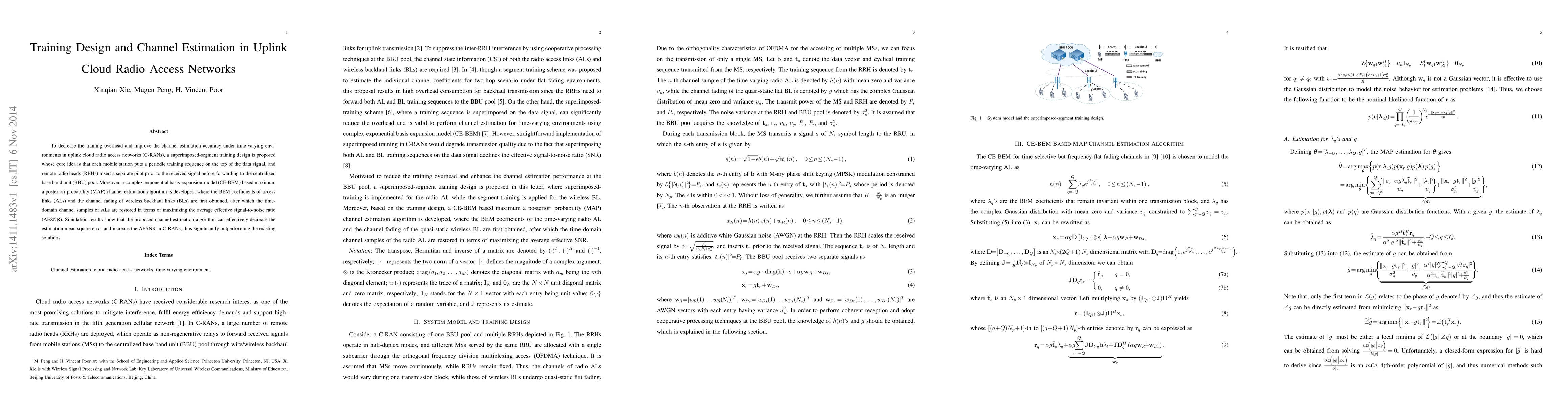 This paper proposes a superimposed-segment training design to reduce training overhead and enhance channel estimation in uplink cloud radio access networks. It introduces a complex-exponential basis-expansion-model based channel estimation algorithm that maximizes a posteriori probability, achieving lower mean square error and higher average effective signal-to-noise ratio compared to existing methods.