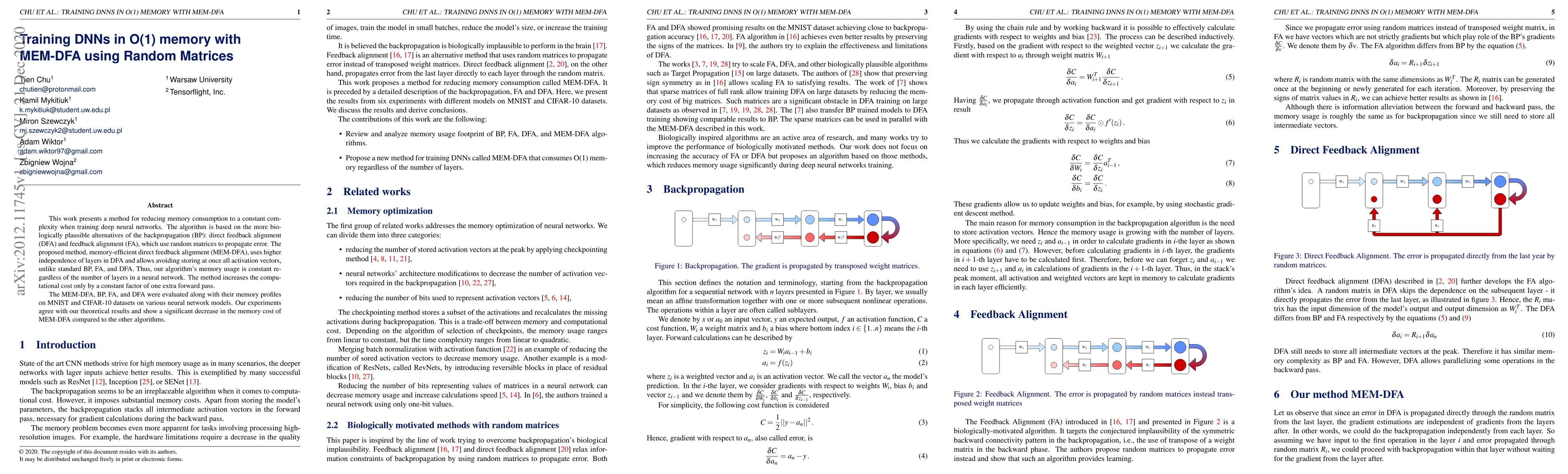 This paper introduces MEM-DFA, a memory-efficient training method for deep neural networks that reduces memory consumption to constant complexity, leveraging direct feedback alignment with random matrices. Experimental results on MNIST and CIFAR-10 datasets show MEM-DFA significantly lowers memory usage compared to backpropagation, FA, and DFA.