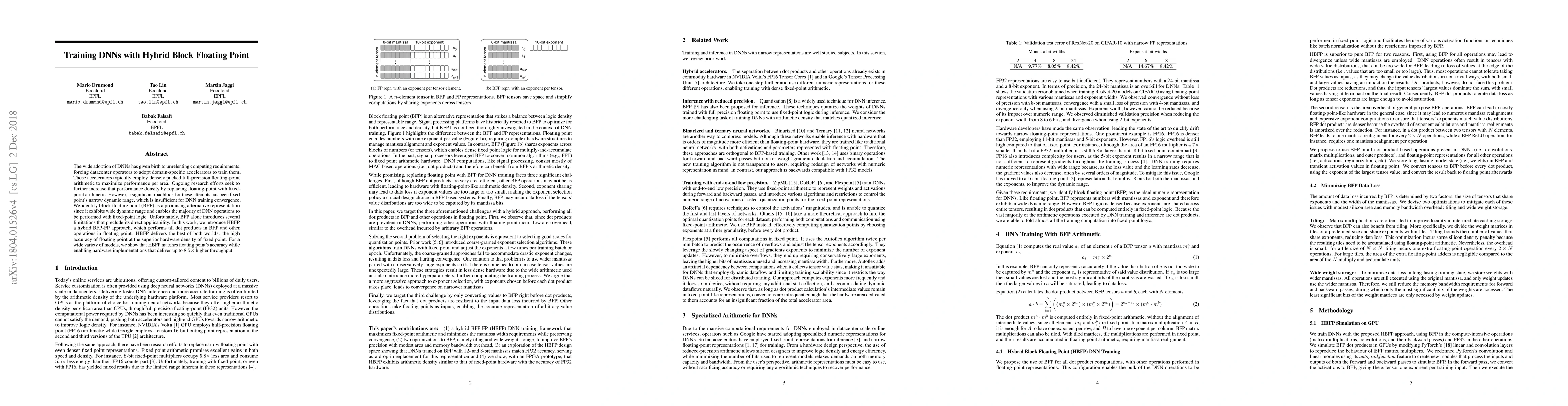 This paper proposes HBFP, a hybrid block floating point and floating point approach for training deep neural networks (DNNs), aiming to combine the high accuracy of floating point with the hardware density benefits of fixed point. The results show that HBFP achieves comparable accuracy to full floating point while significantly increasing throughput.