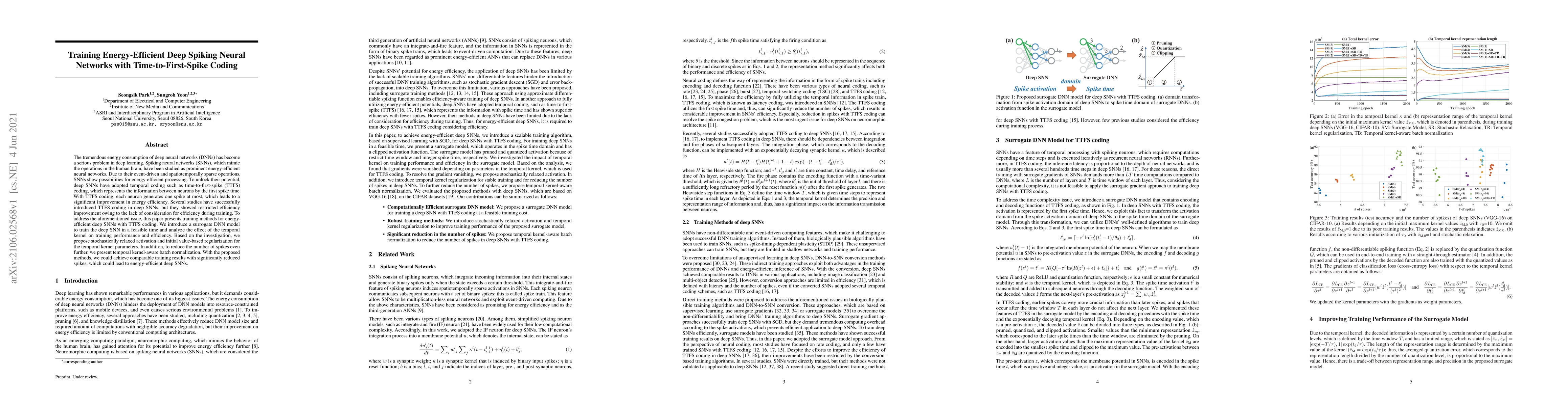 This paper proposes training methods for energy-efficient deep spiking neural networks using time-to-first-spike coding, introducing surrogate DNN models, temporal kernel regularization, and temporal kernel-aware batch normalization to achieve comparable training results with significantly fewer spikes.