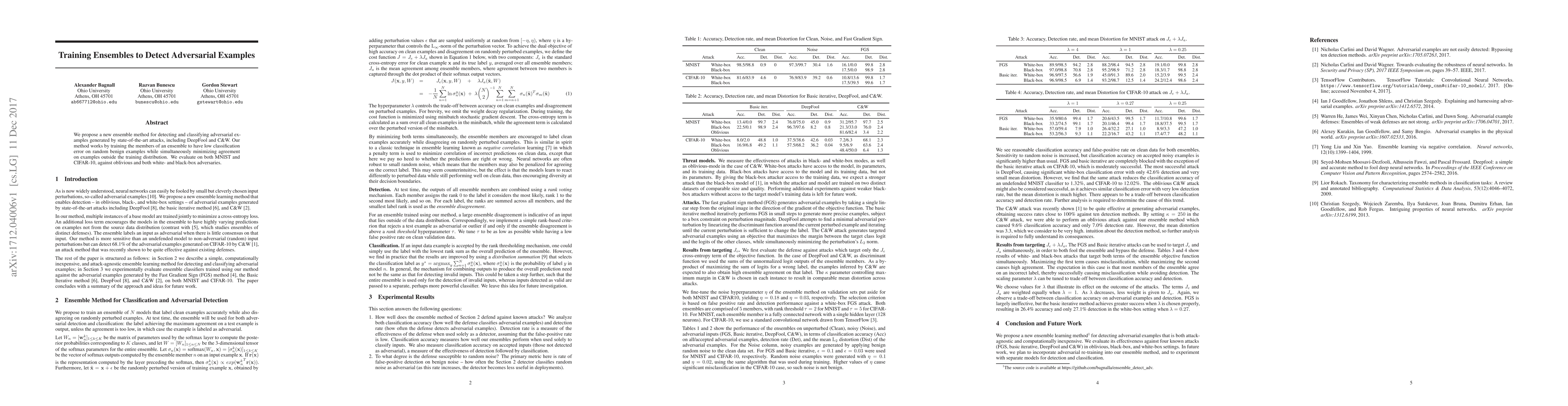 This paper proposes a new ensemble method for detecting adversarial examples, training models to minimize error on benign examples while disagreeing on malicious ones, with strong results on MNIST and CIFAR-10 datasets.