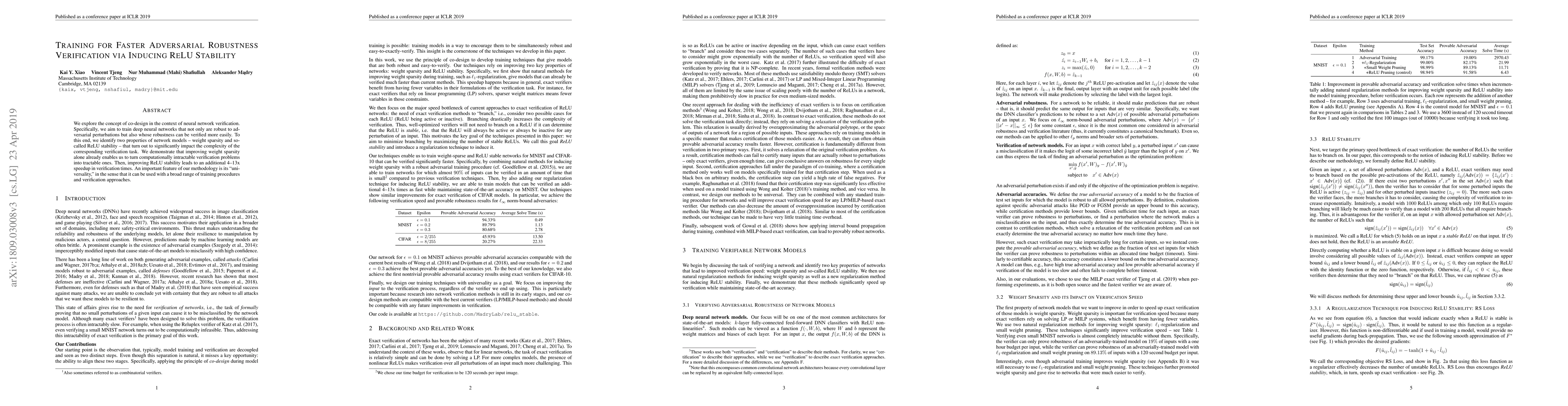 Researchers developed a method to train neural networks that are both robust to adversarial attacks and easy to verify, achieving significant speedup in verification times through weight sparsity and ReLU stability.