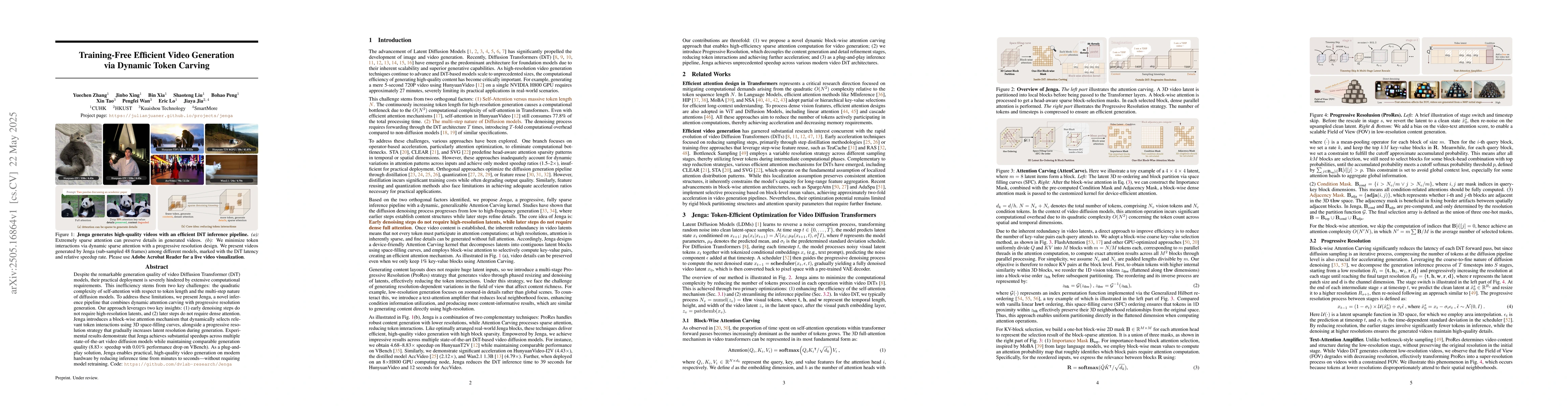 Jenga distinguishes itself by being a training-free, plug-and-play solution that addresses the computational inefficiencies of existing video diffusion models through innovative attention carving and resolution strategies.