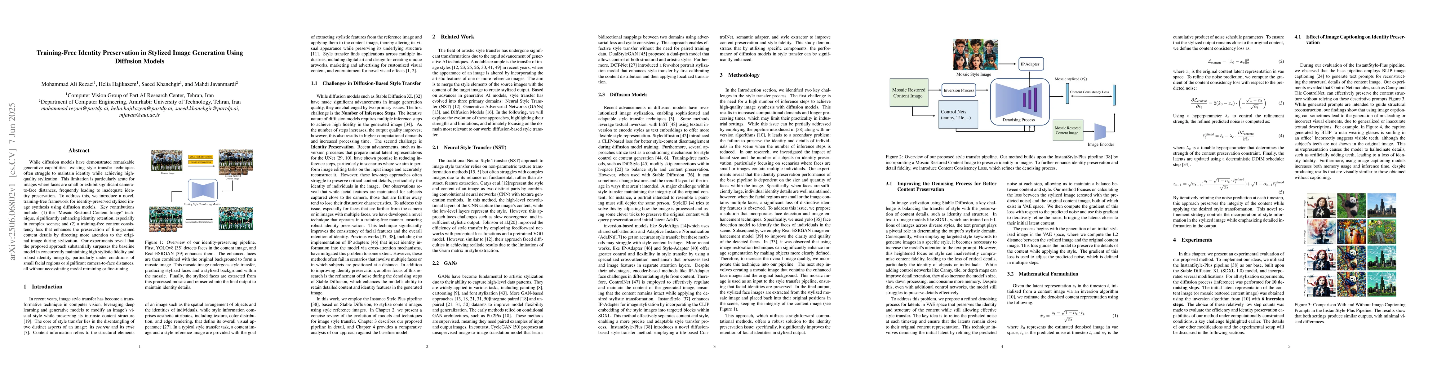 This research introduces a training-free framework for diffusion models to generate stylized images that preserve identity, especially in challenging cases like small faces or large camera-to-face distances. It uses 'Mosaic Restored Content Image' technique and a content consistency loss, significantly improving identity retention and fine-grained detail preservation without model retraining.
