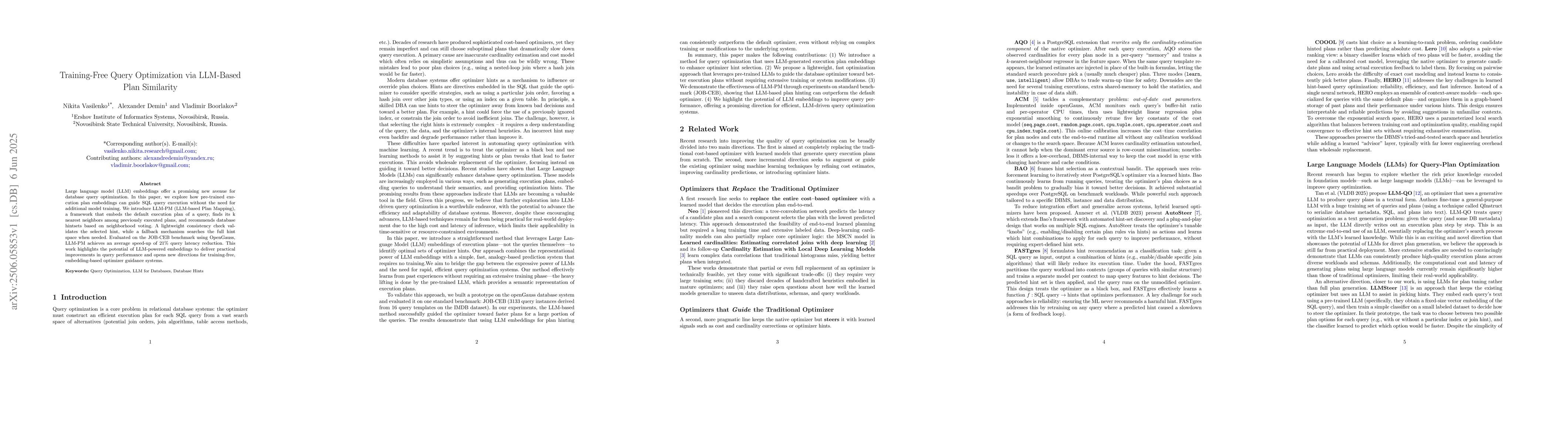 The research introduces LLM-PM, a framework that utilizes pre-trained execution plan embeddings to guide SQL query execution without additional model training. It embeds default execution plans, identifies k nearest neighbors among executed plans, and recommends hintsets via neighborhood voting. A consistency check validates the hint, and a fallback mechanism explores the full hint space if necessary.