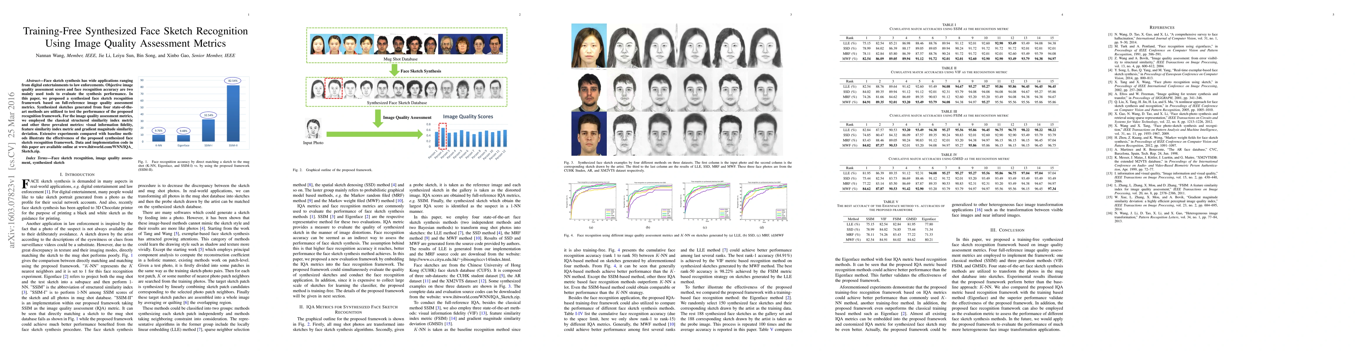 This paper proposes a training-free synthesized face sketch recognition framework based on full-reference image quality assessment metrics, including the structured similarity index, visual information fidelity, feature similarity index, and gradient magnitude similarity deviation. Experimental results demonstrate the effectiveness of the proposed framework compared to baseline methods.